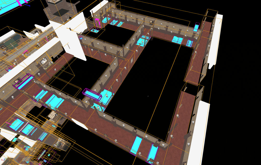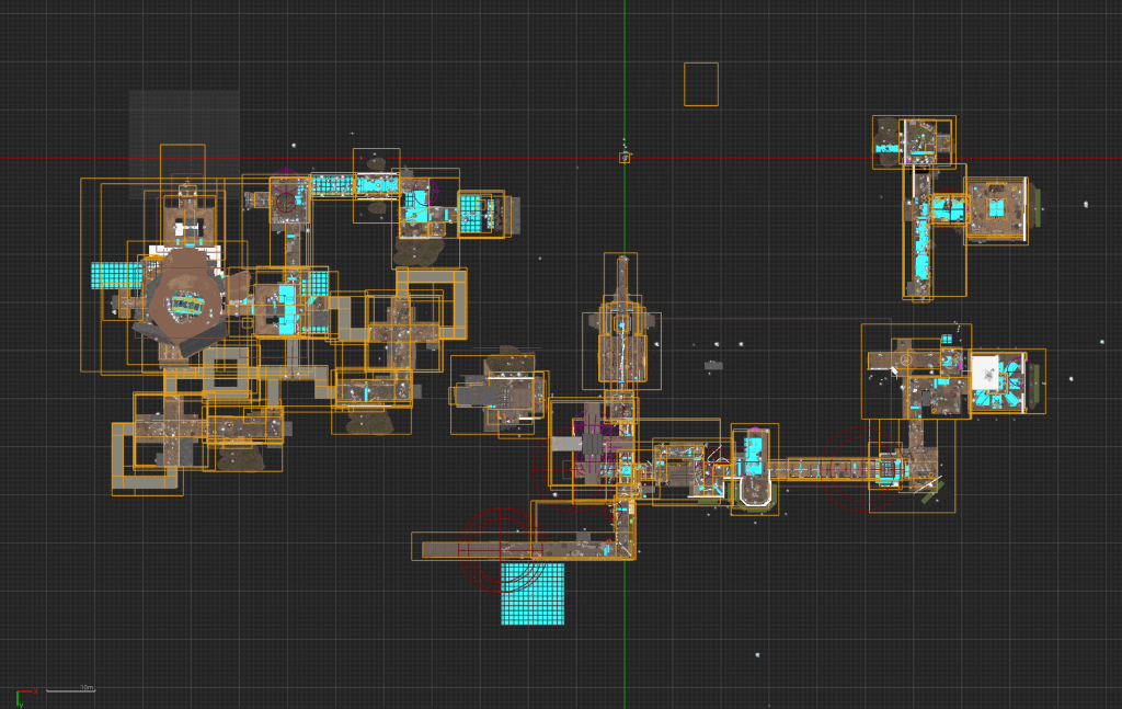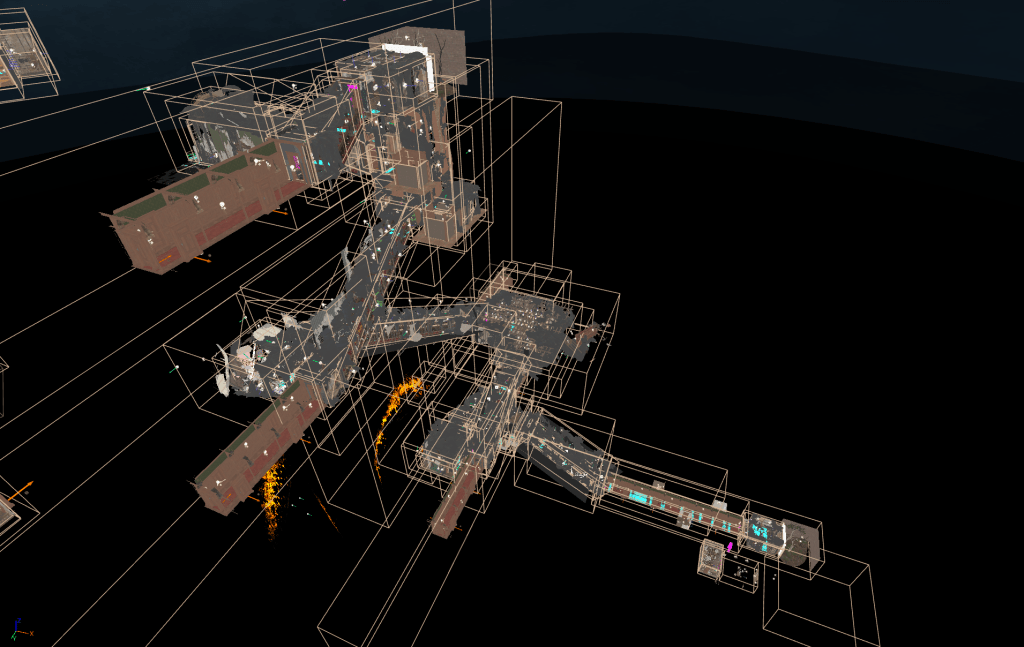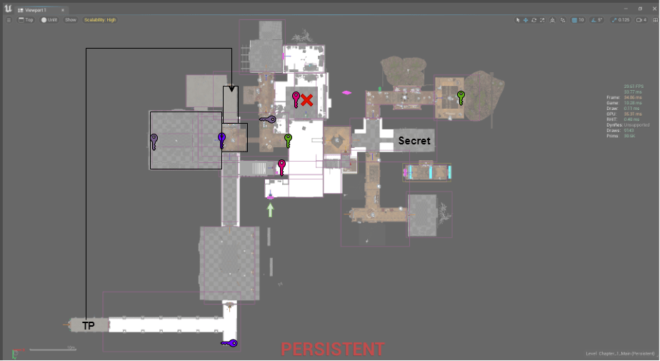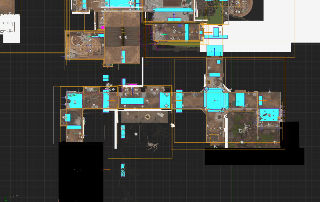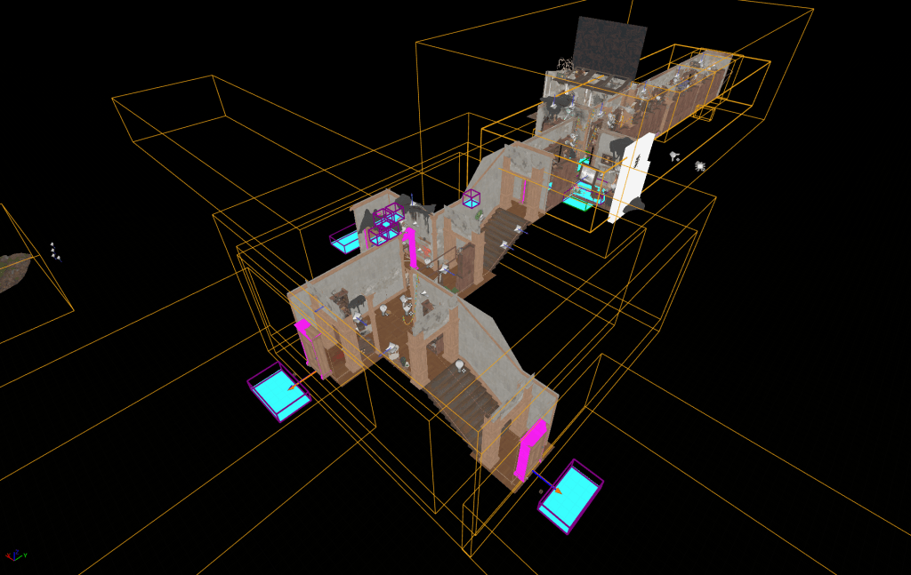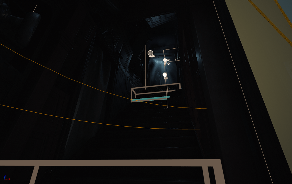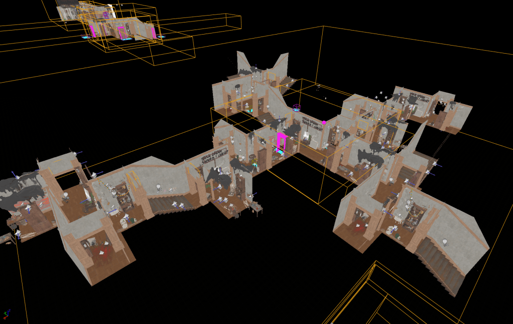 In this case the level baseline had already been created and several events were pre‑scripted. My main tasks for this chapter were the technical setup — e.g., setting up teleports, loops, overall level flow and streaming — and a mood pass, meaning placement of smaller and medium horror events such as falling elements, collapsing furniture, changing scene elements, etc.