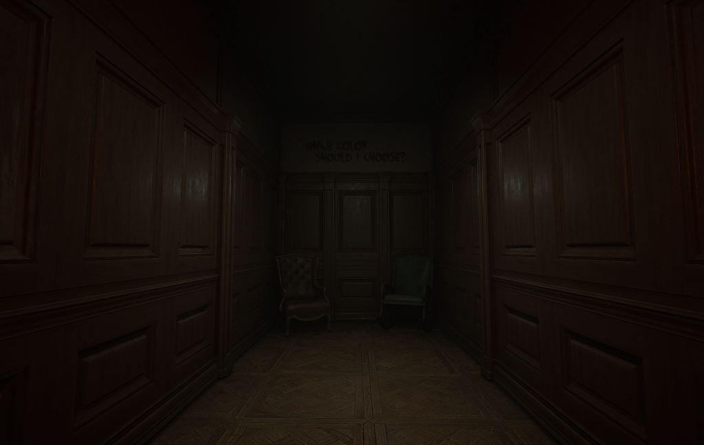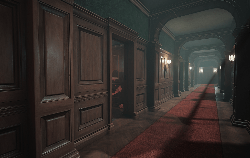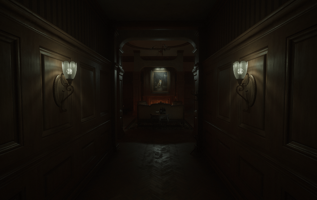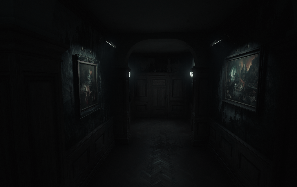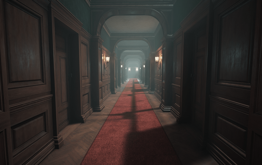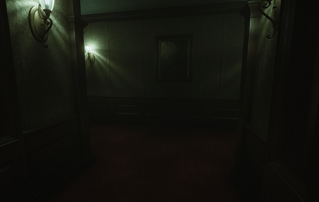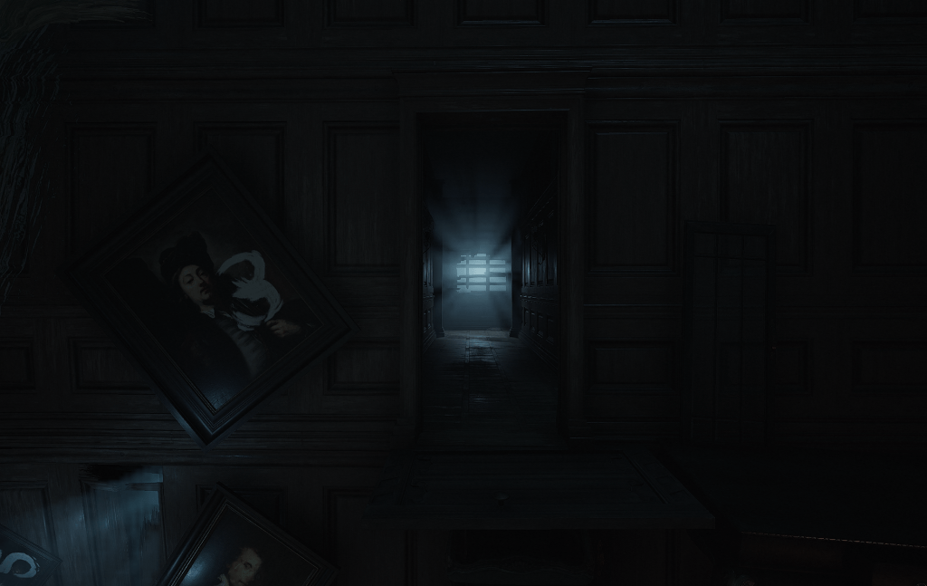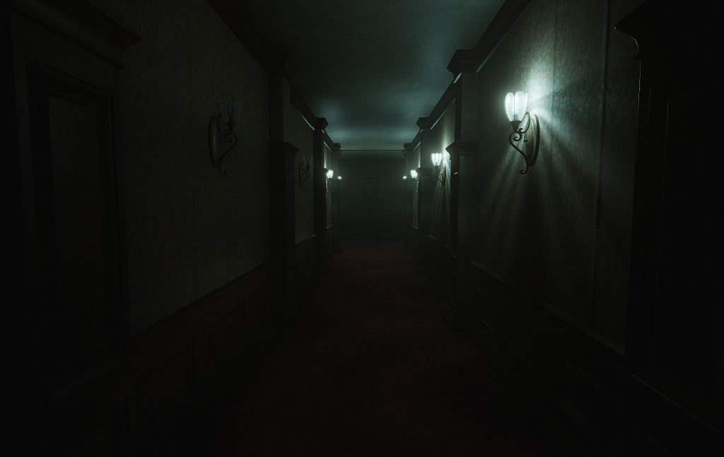 An example of a looped corridor where players choose whether to follow the Wife’s footsteps or take an alternate path. Each loop darkens the space, lights begin to flicker, and it culminates in a hallway reveal with artifacts tied to the Painter or the Wife, depending on the chosen loop.