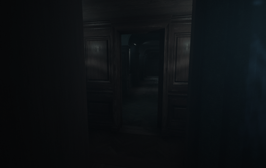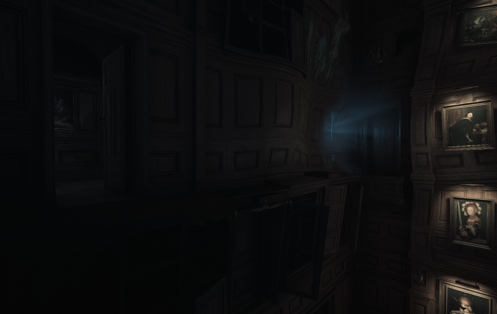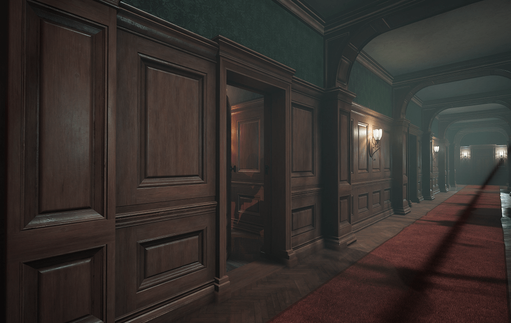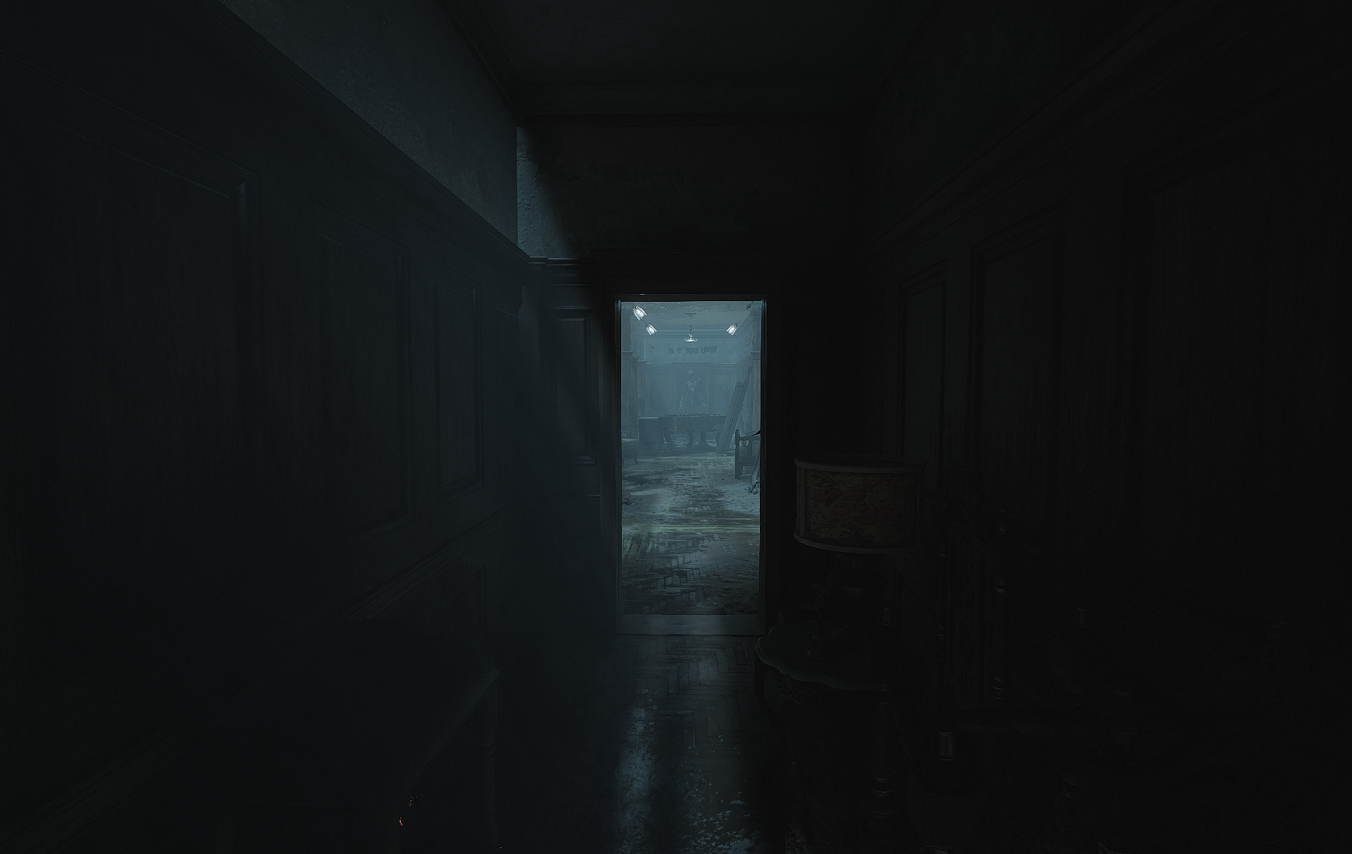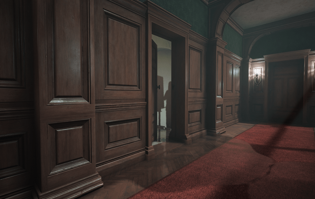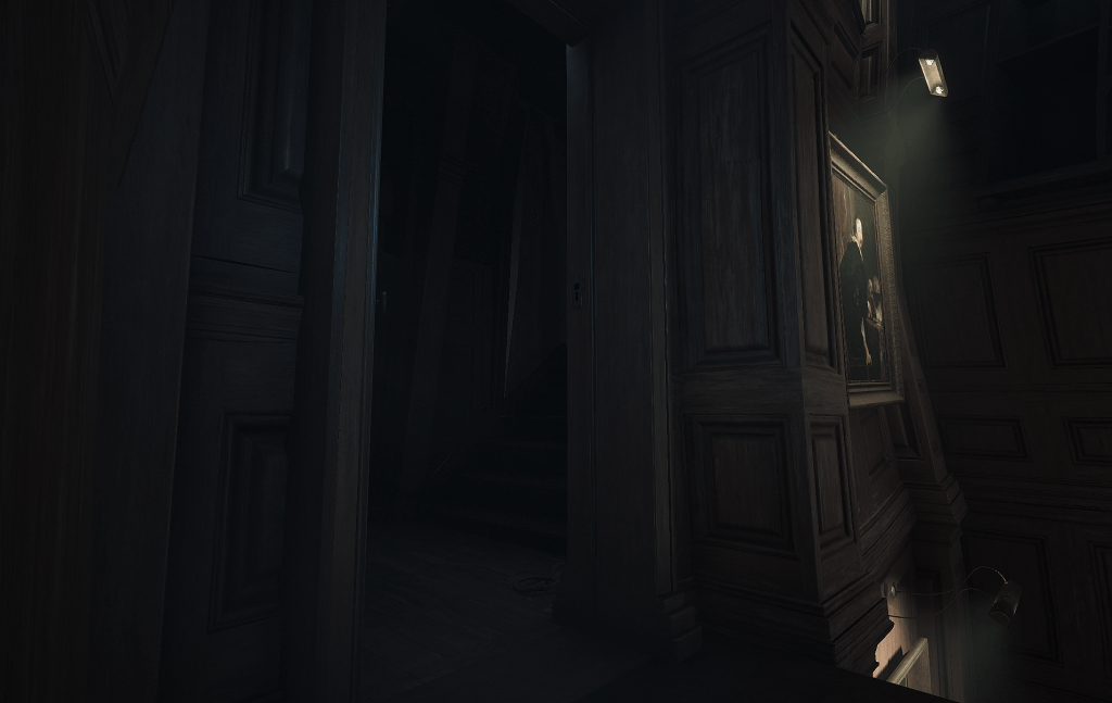 An example of a looped corridor where players choose whether to follow the Wife’s footsteps or take an alternate path. Each loop darkens the space, lights begin to flicker, and it culminates in a hallway reveal with artifacts tied to the Painter or the Wife, depending on the chosen loop.
