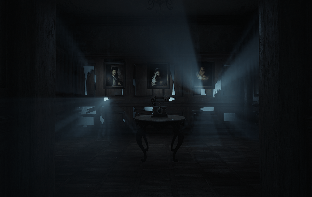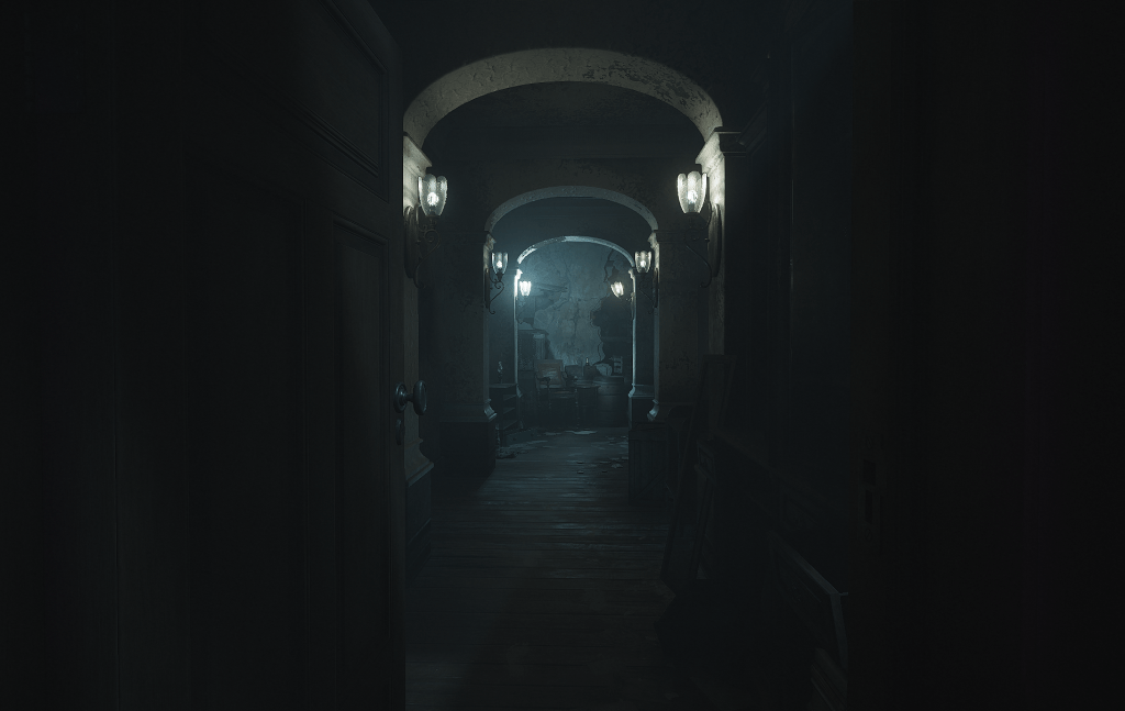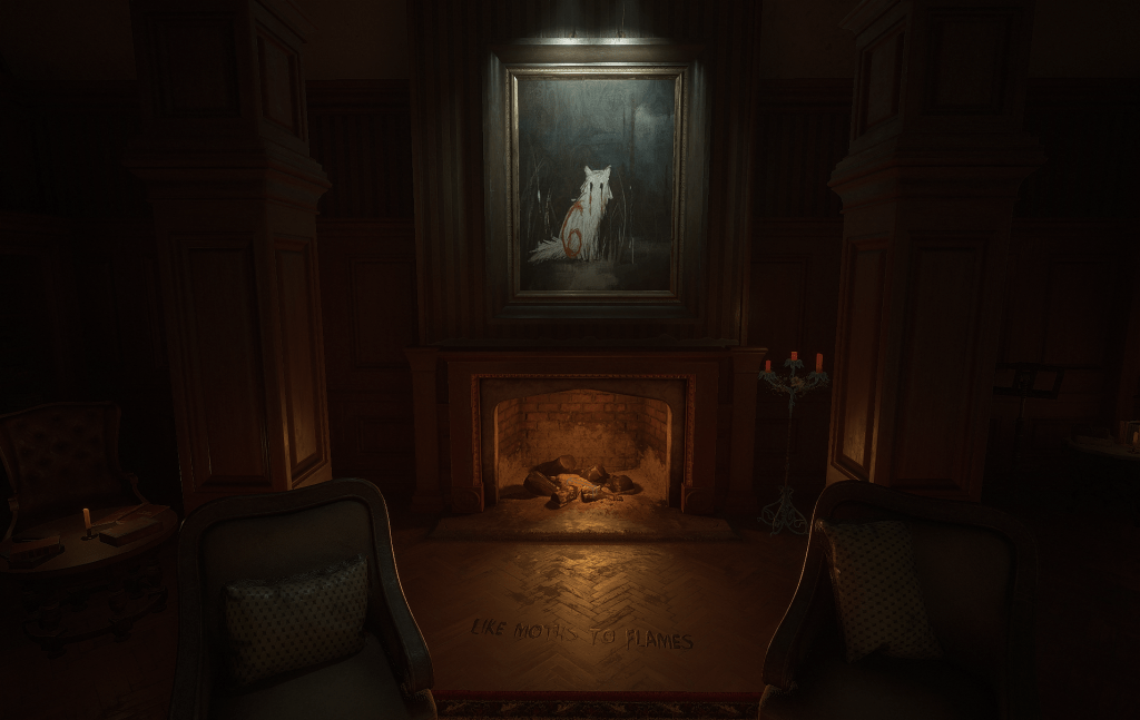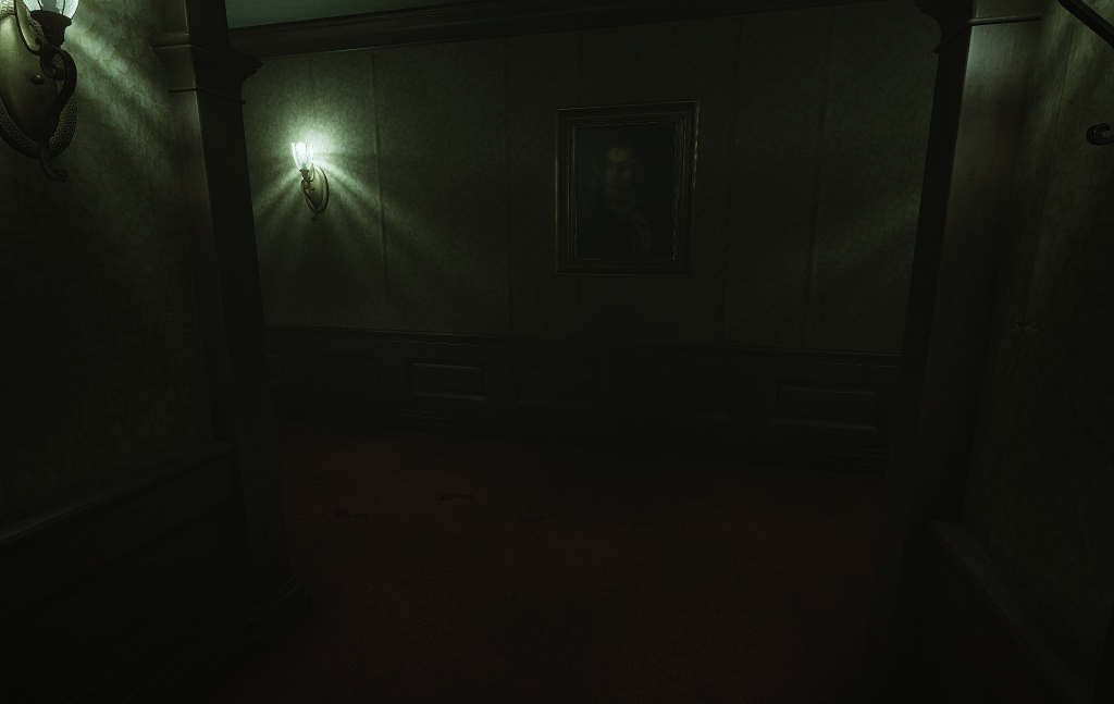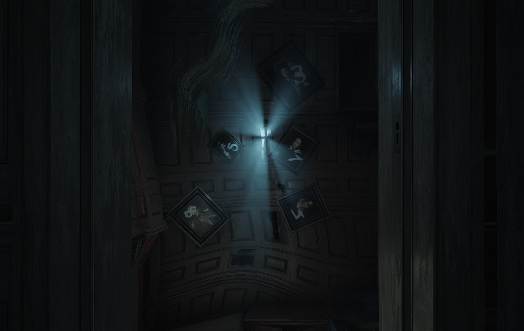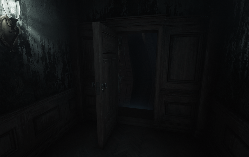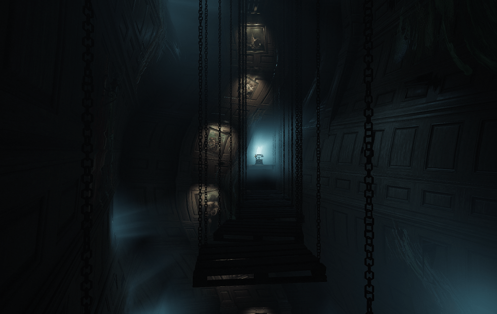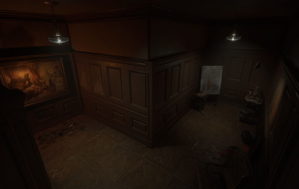 An example of a looped corridor where players choose whether to follow the Wife’s footsteps or take an alternate path. Each loop darkens the space, lights begin to flicker, and it culminates in a hallway reveal with artifacts tied to the Painter or the Wife, depending on the chosen loop.