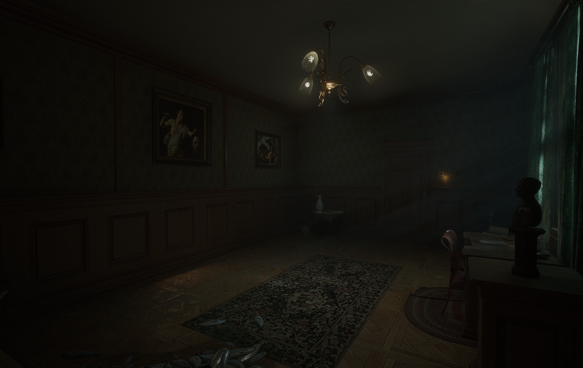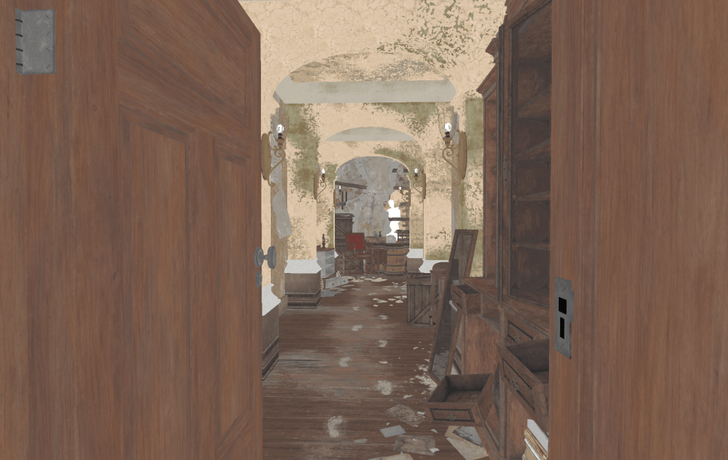 This was another chapter I took responsibility for in terms of baseline and technical setup. It was one of the chapters we produced practically last. Its first iteration had a slightly different structure, somewhat reminiscent of Resident Evil — the player encountered locked rooms and had to find the appropriate key to open them. The structure was still linear but took a different form.