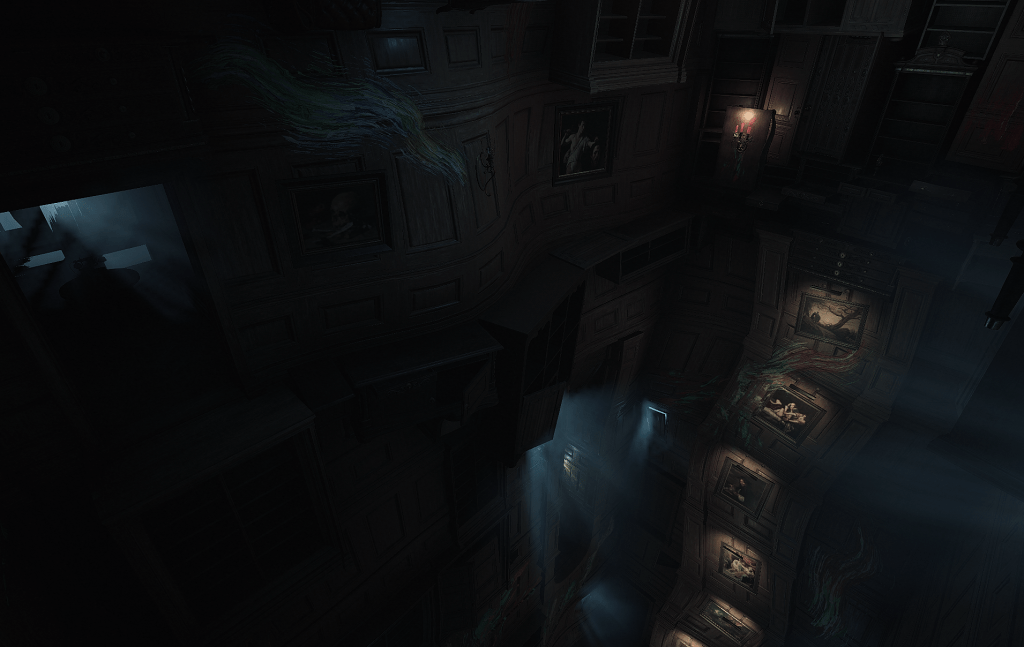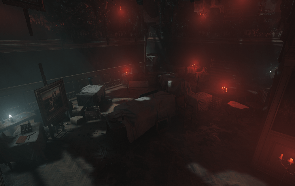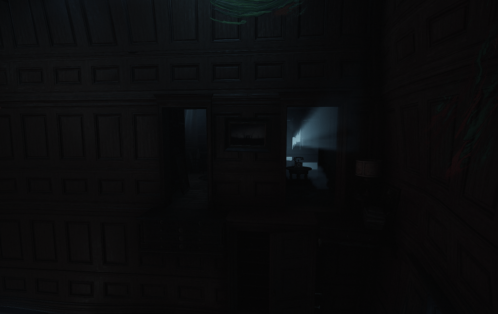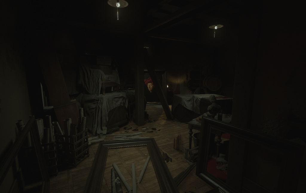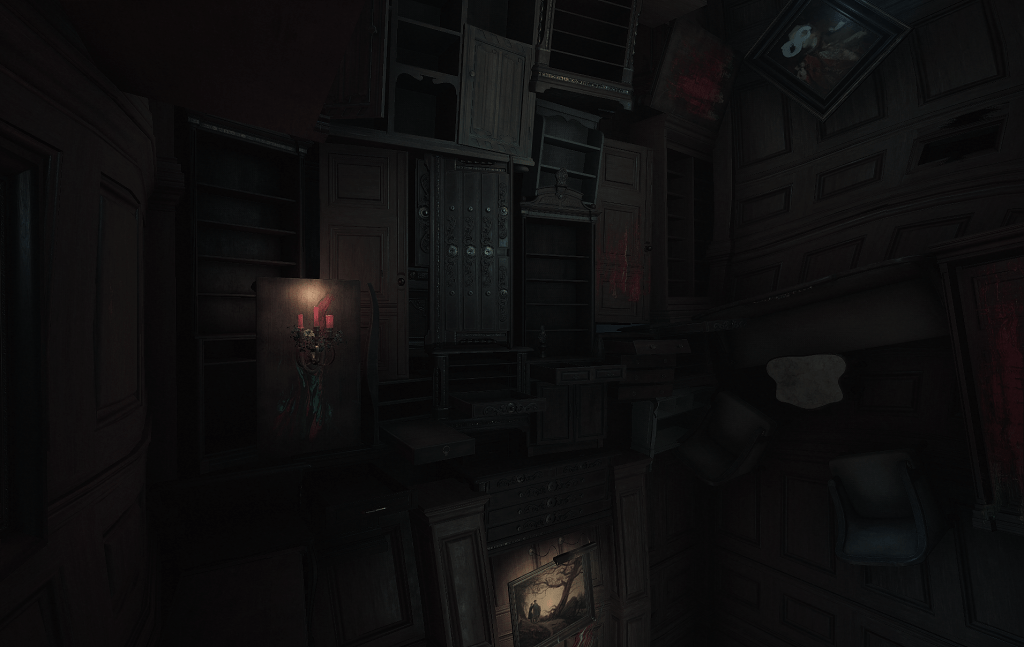 The original sequence was too long, and the encounter with the wife as an enemy felt unsatisfying – players chose either to approach her or retreat back to the room (escape her). We reworked the encounter’s format: the sequence begins similarly – paintings start shaking, fall off the structure, and we see rats running toward the exit. Those rats are fleeing from the Wife, triggering a short combat where the player must escape, destroying Light Sensitive Objects along the way to clear a path. At the end, the player has to squeeze between shelves to evade the Wife, which ends the combat sequence.