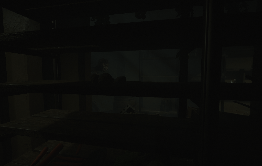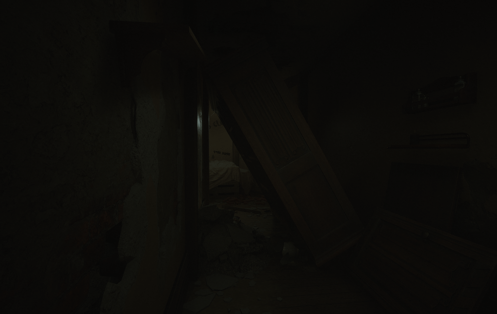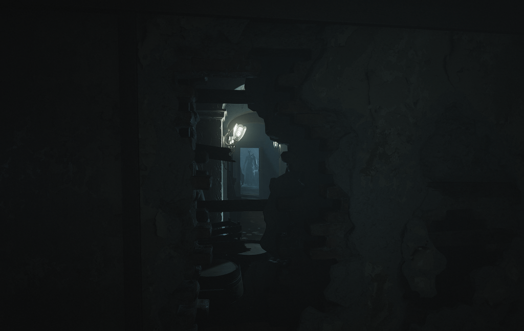 One of the first sequences showcasing destructible objects and introducing the first encounter with the Wife. Upon entering the room, we see the Wife, who vanishes as a lightbulb explodes, which also triggers crates to break apart. Moving through a narrow corridor, we repeatedly encounter destruction. Reaching the spot where she disappeared, we see the Wife through a hole, which triggers the door to slam shut.