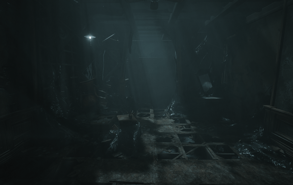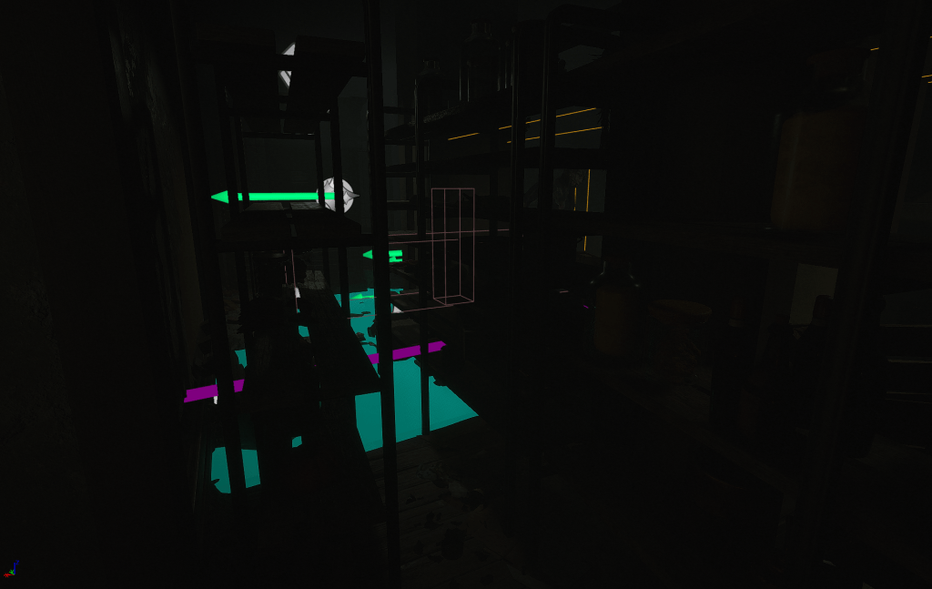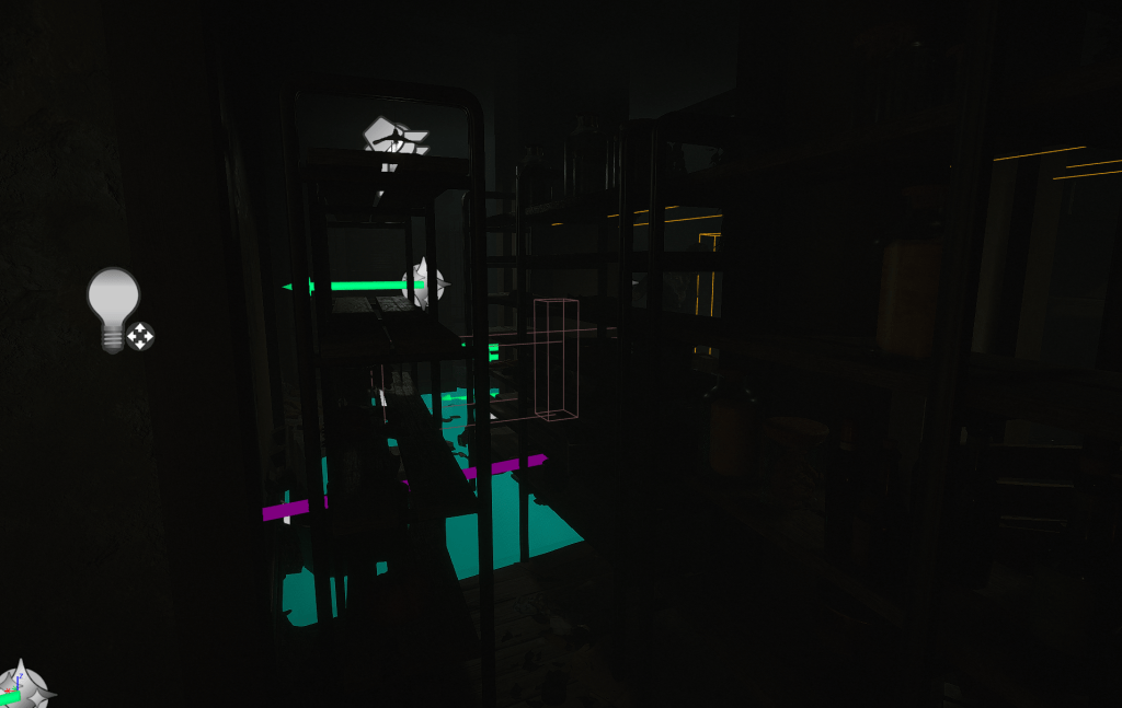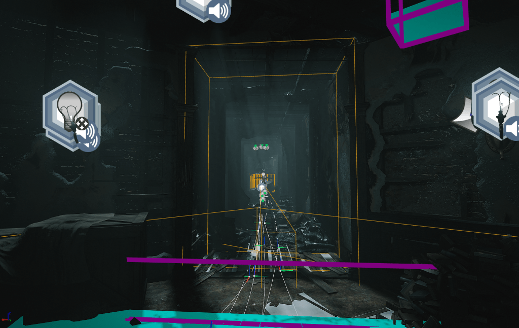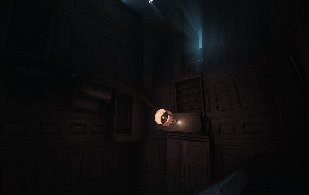 This is a new room in the game – the core idea was to guide players to the exit by “switching” between the lower and upper (more destroyed) versions of the room. Using Light Sensitive Objects transports players to the alternative version of the space.