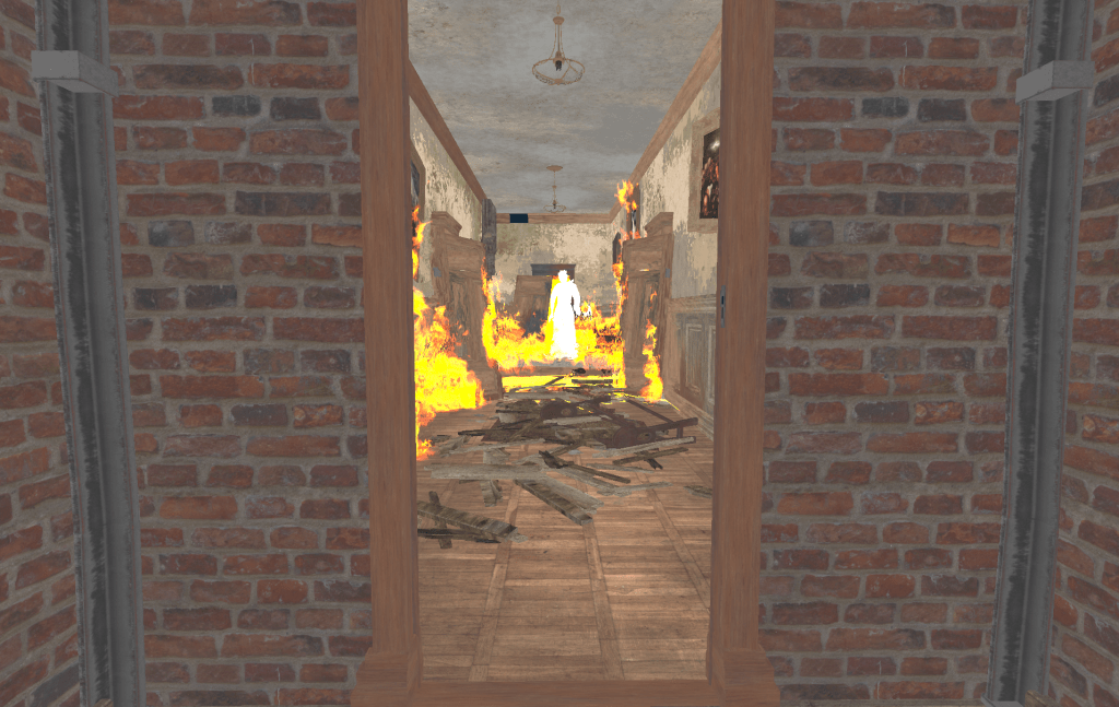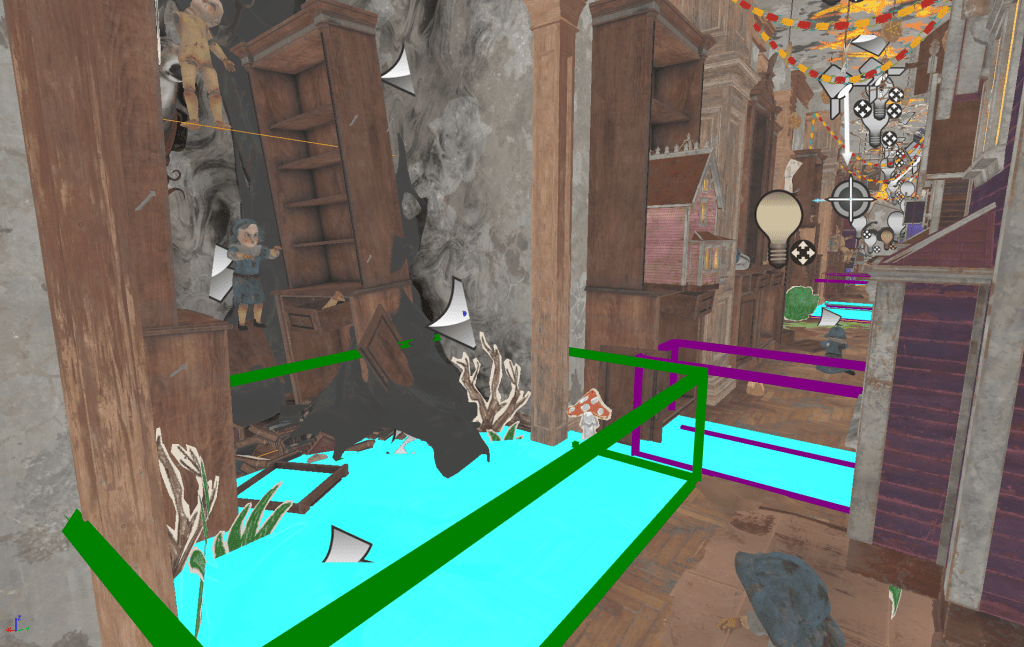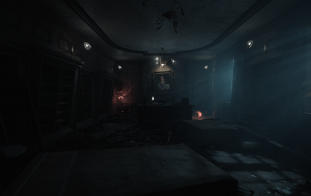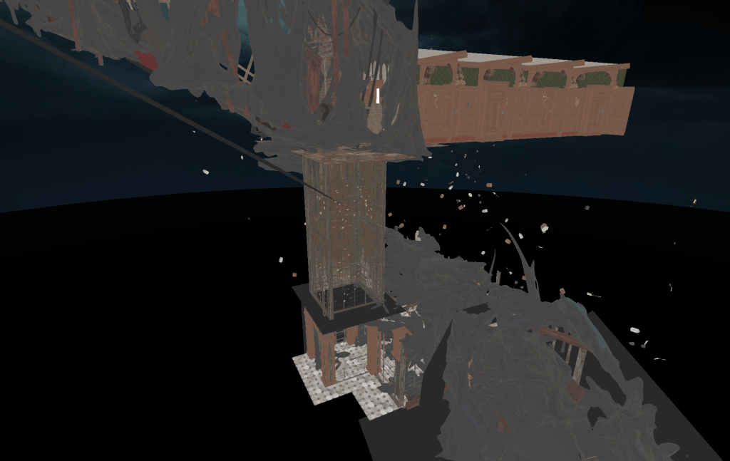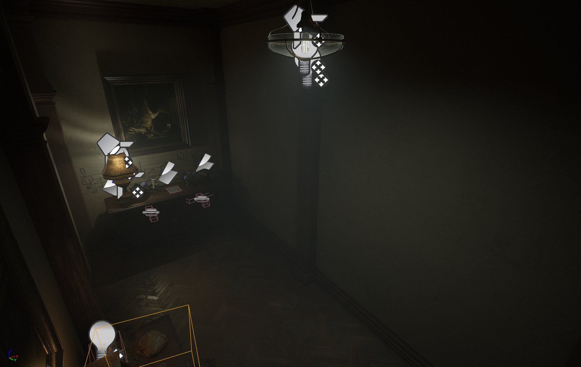 This is a new room in the game – the core idea was to guide players to the exit by “switching” between the lower and upper (more destroyed) versions of the room. Using Light Sensitive Objects transports players to the alternative version of the space.