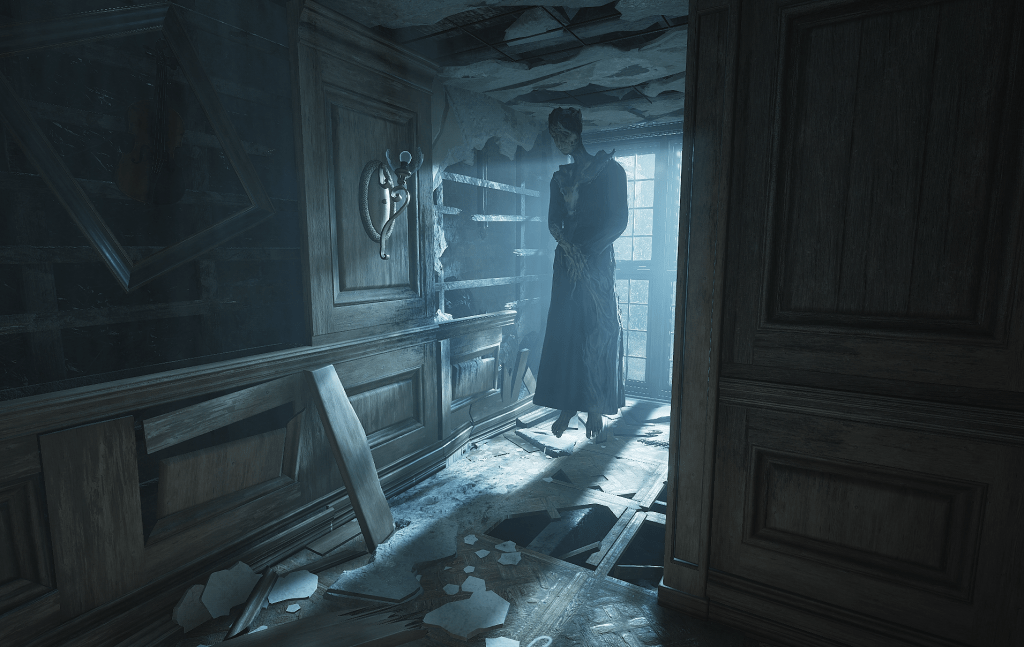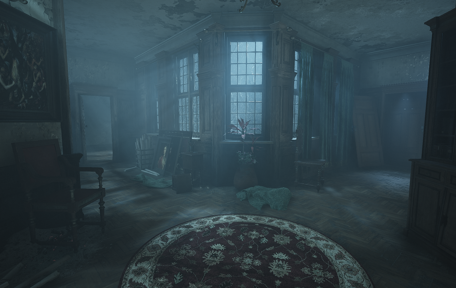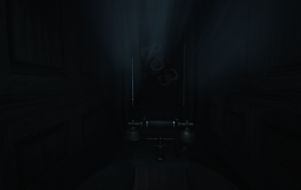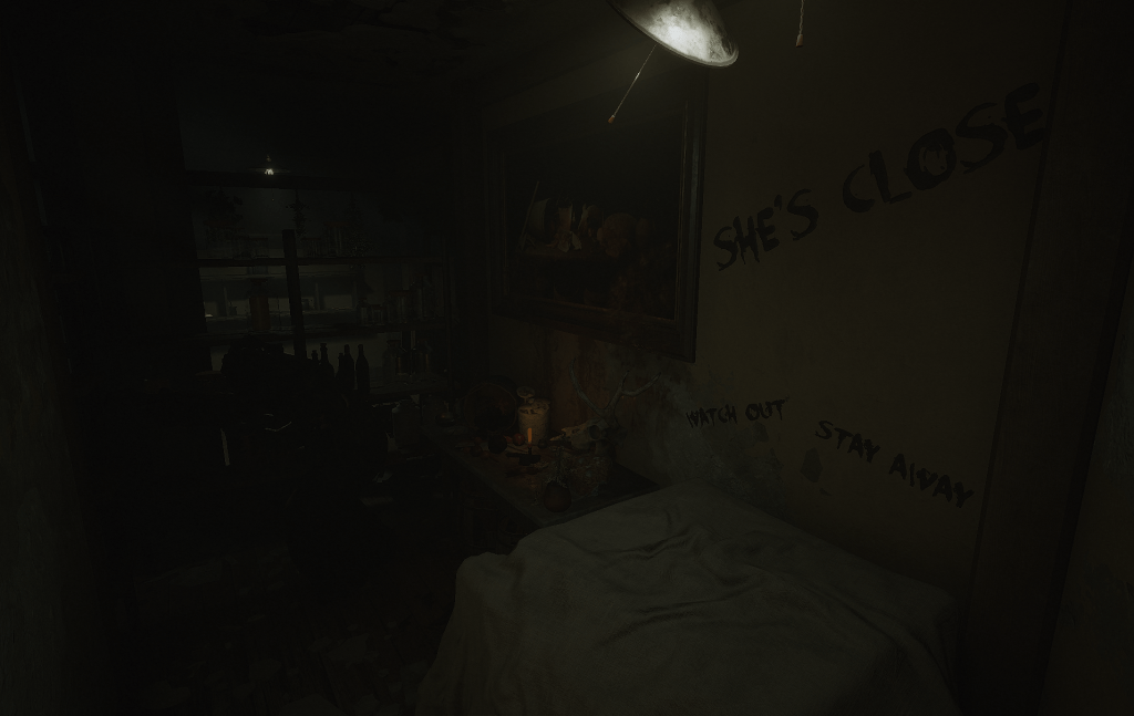 Jump scare setups – the Wife behind the window disappears as you approach, and when you turn around, you see her moving into the next room, foreshadowing the final “combat”.