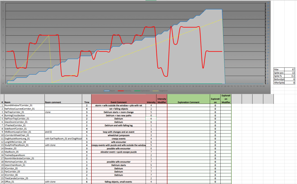 A large part of the work involved using reused rooms from LoF 2016 and changing the flow according to the agreed intensity curve — for each chapter we listed and designed events, assigned them a scariness scale, and then placed them on a timeline, trying to obtain the appropriate intensity curve with two peaks.