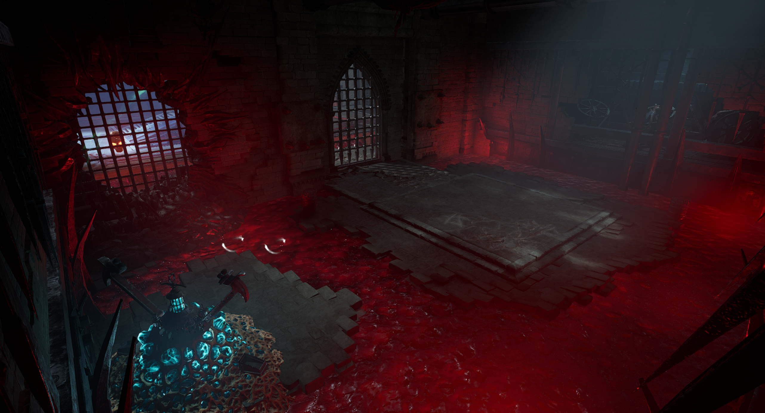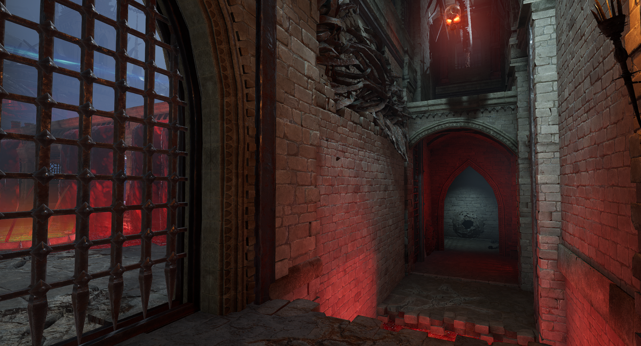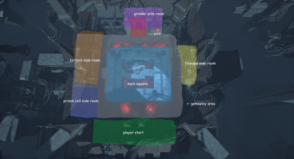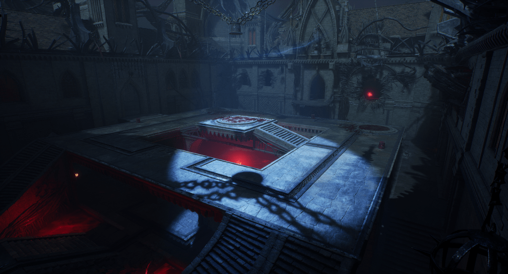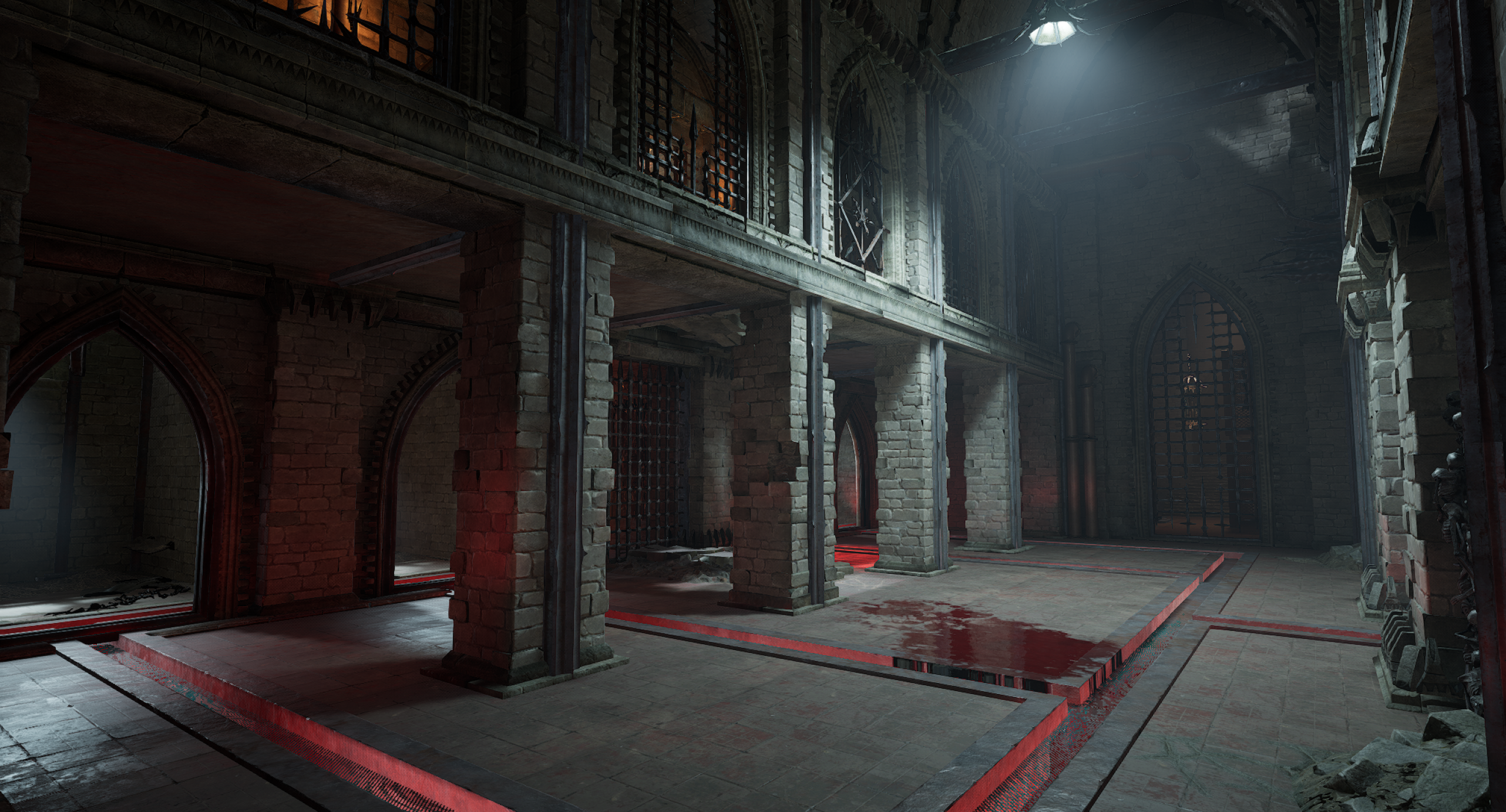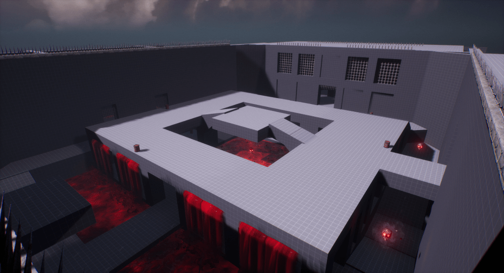 This is another arena loosely referencing the setting from the OG Painkiller — the Prison level. We wanted to capture a few key elements, such as the cell exit and the guard tower overlooking the arena. Our interpretation is a blood-soaked prison with a large blood pool in the center of the arena. As for the level’s overall form, I was heavily inspired by arenas from retro shooters like Quake. The arena features sharp angles and simple shapes. It includes side rooms that are accessible depending on the randomly selected objective for the arena. Environment art was done by Eryk Kossakowski.