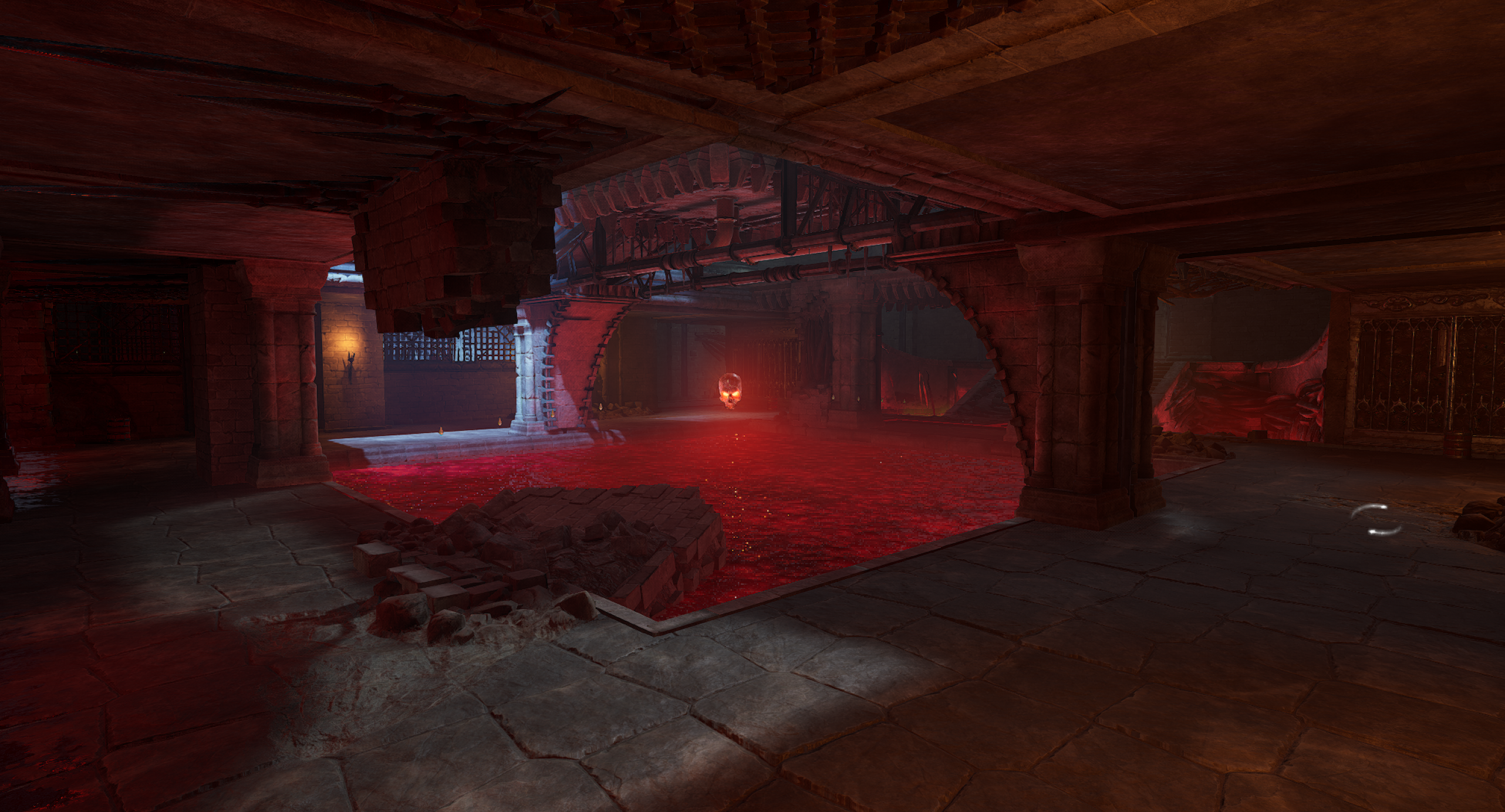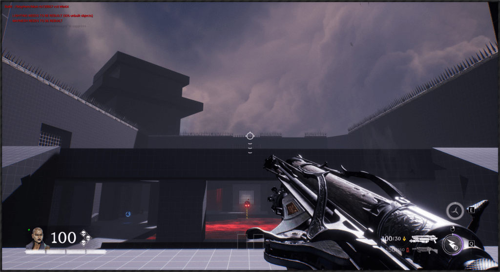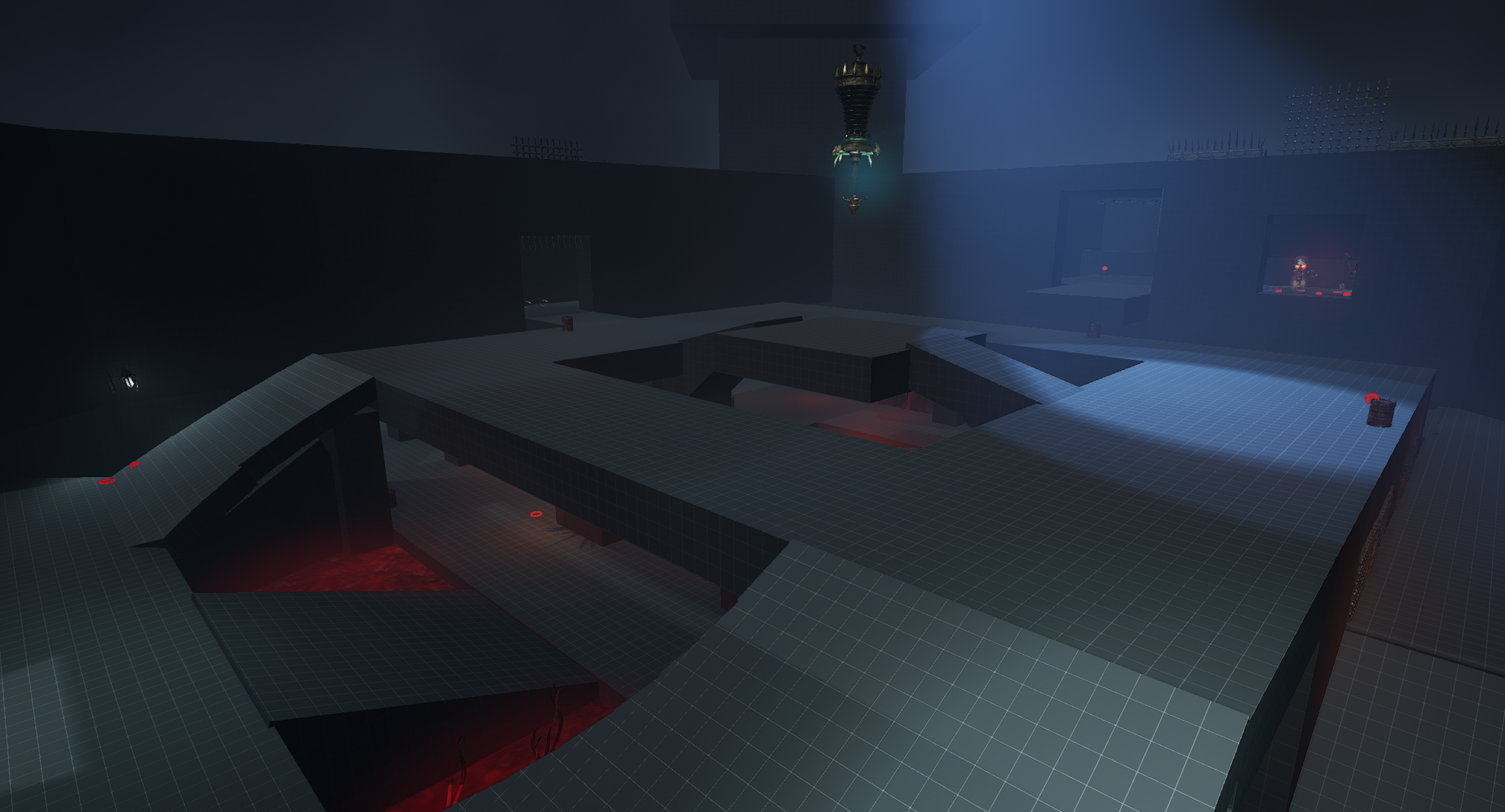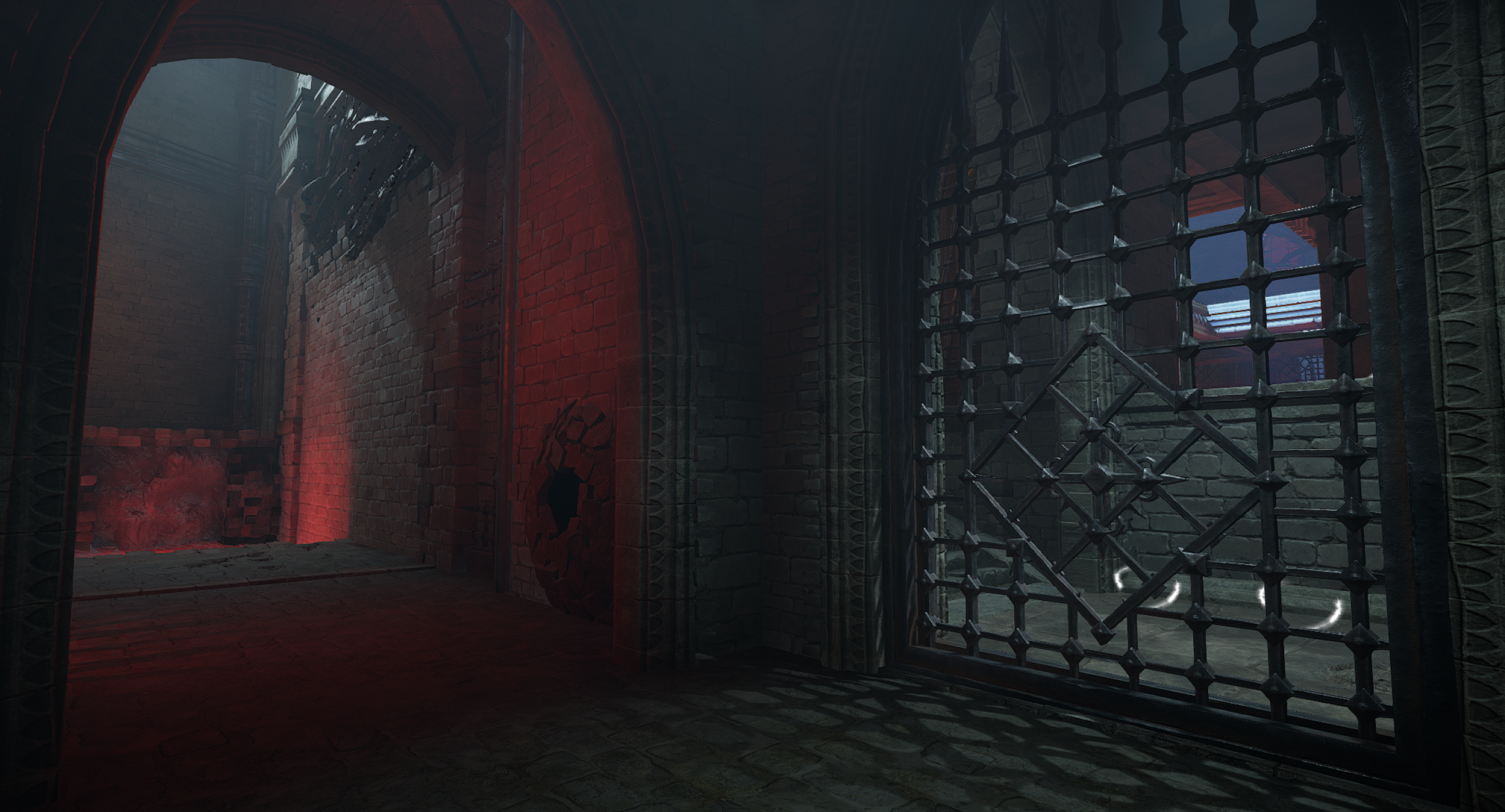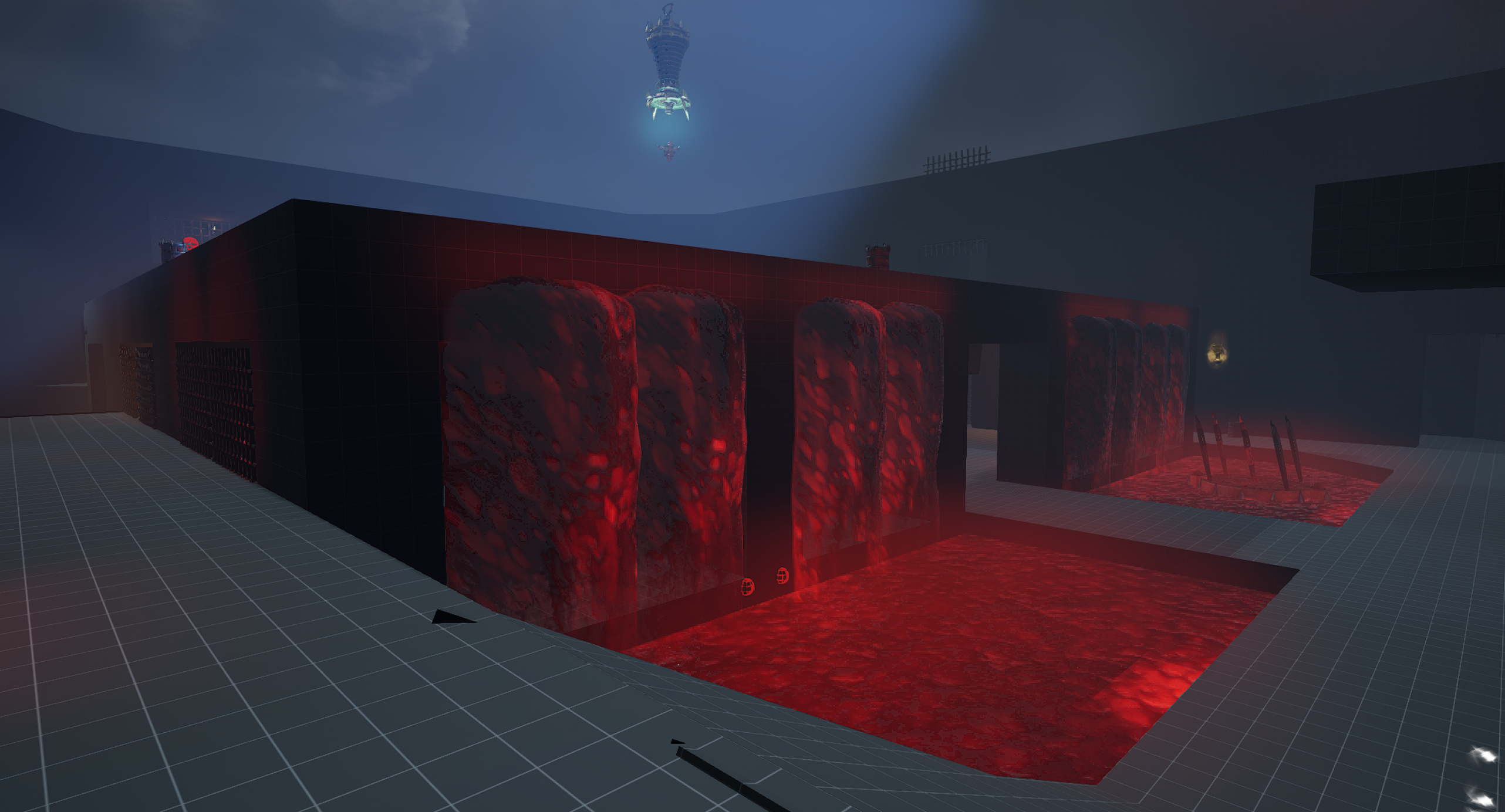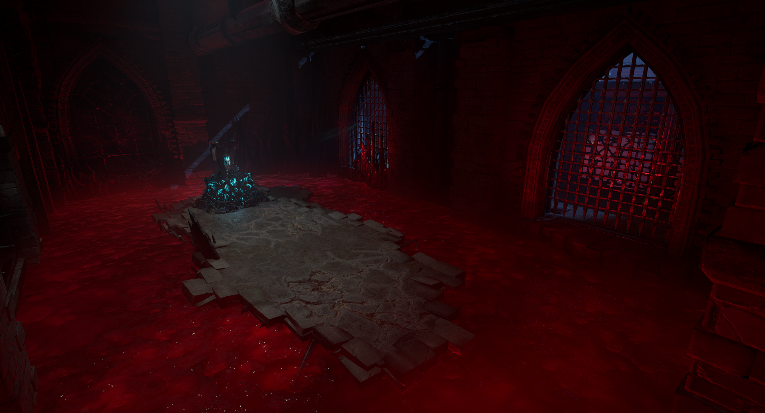 This is another arena loosely referencing the setting from the OG Painkiller — the Prison level. We wanted to capture a few key elements, such as the cell exit and the guard tower overlooking the arena. Our interpretation is a blood-soaked prison with a large blood pool in the center of the arena. As for the level’s overall form, I was heavily inspired by arenas from retro shooters like Quake. The arena features sharp angles and simple shapes. It includes side rooms that are accessible depending on the randomly selected objective for the arena. Environment art was done by Eryk Kossakowski.