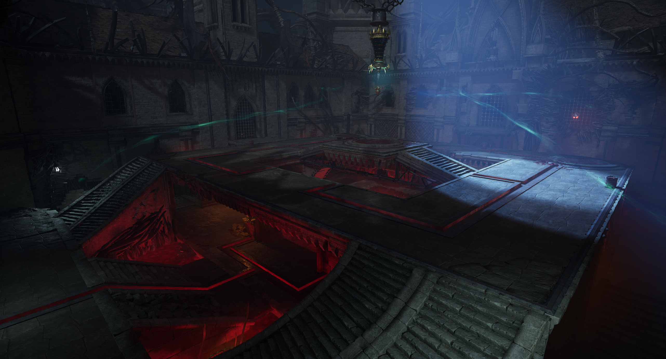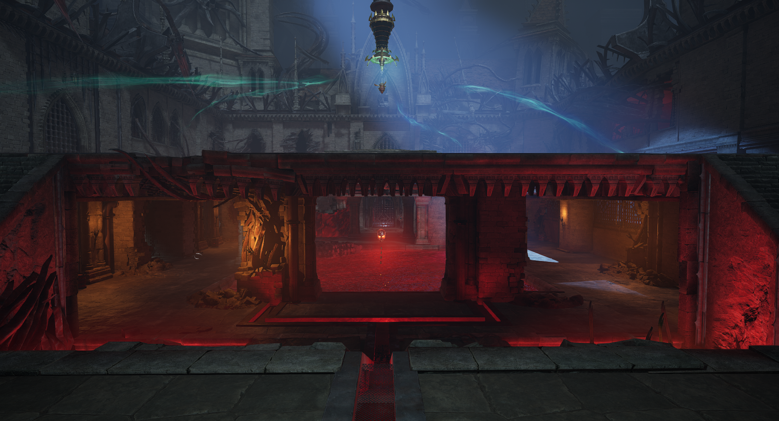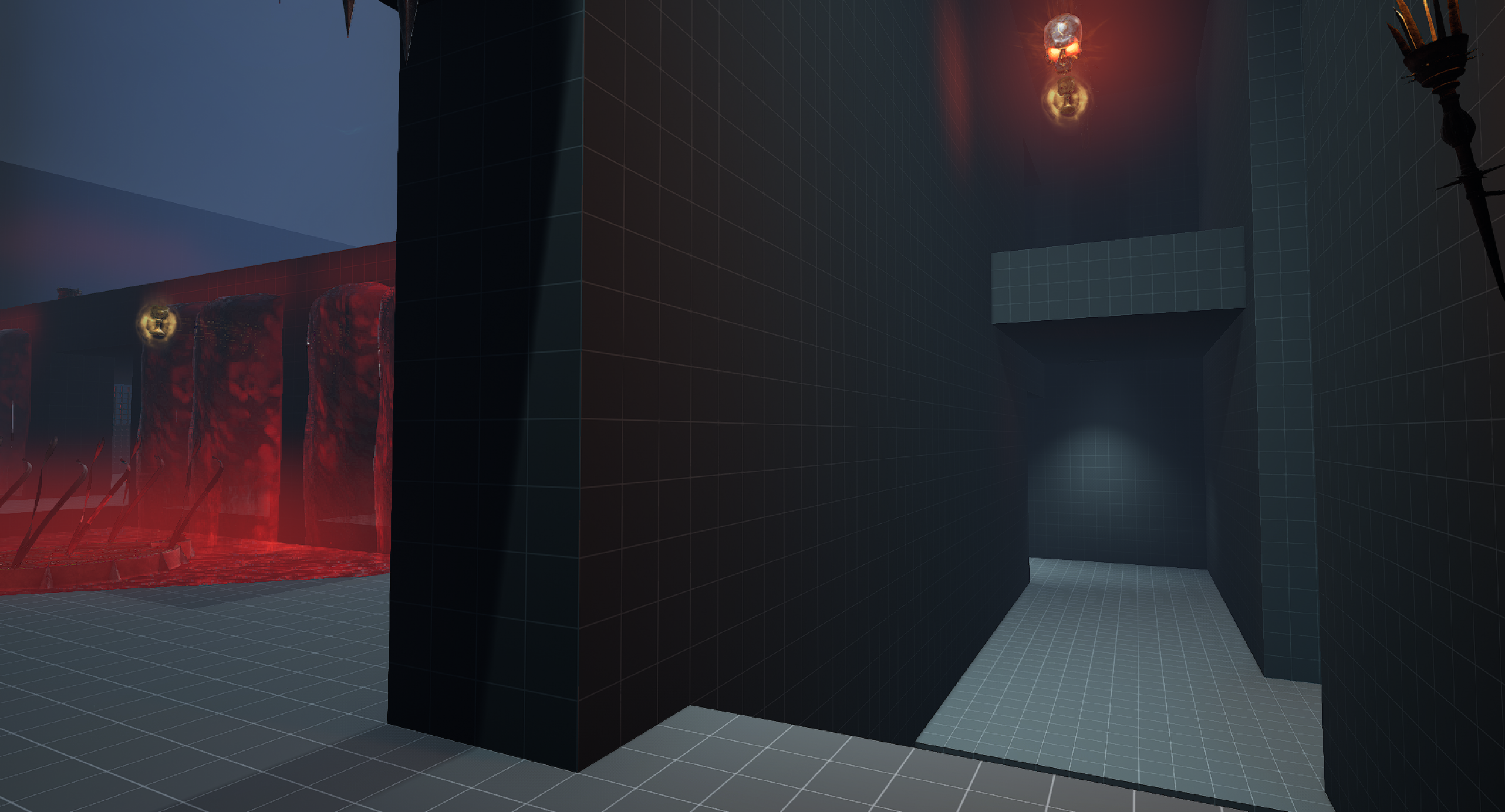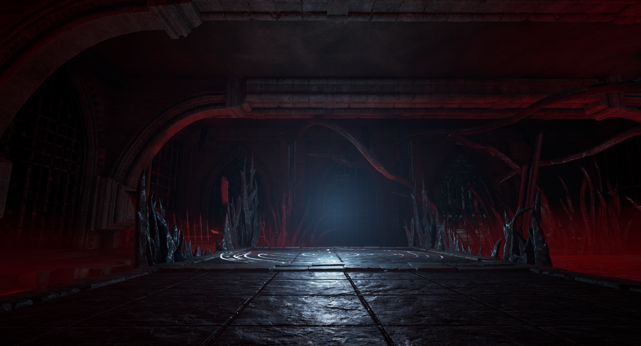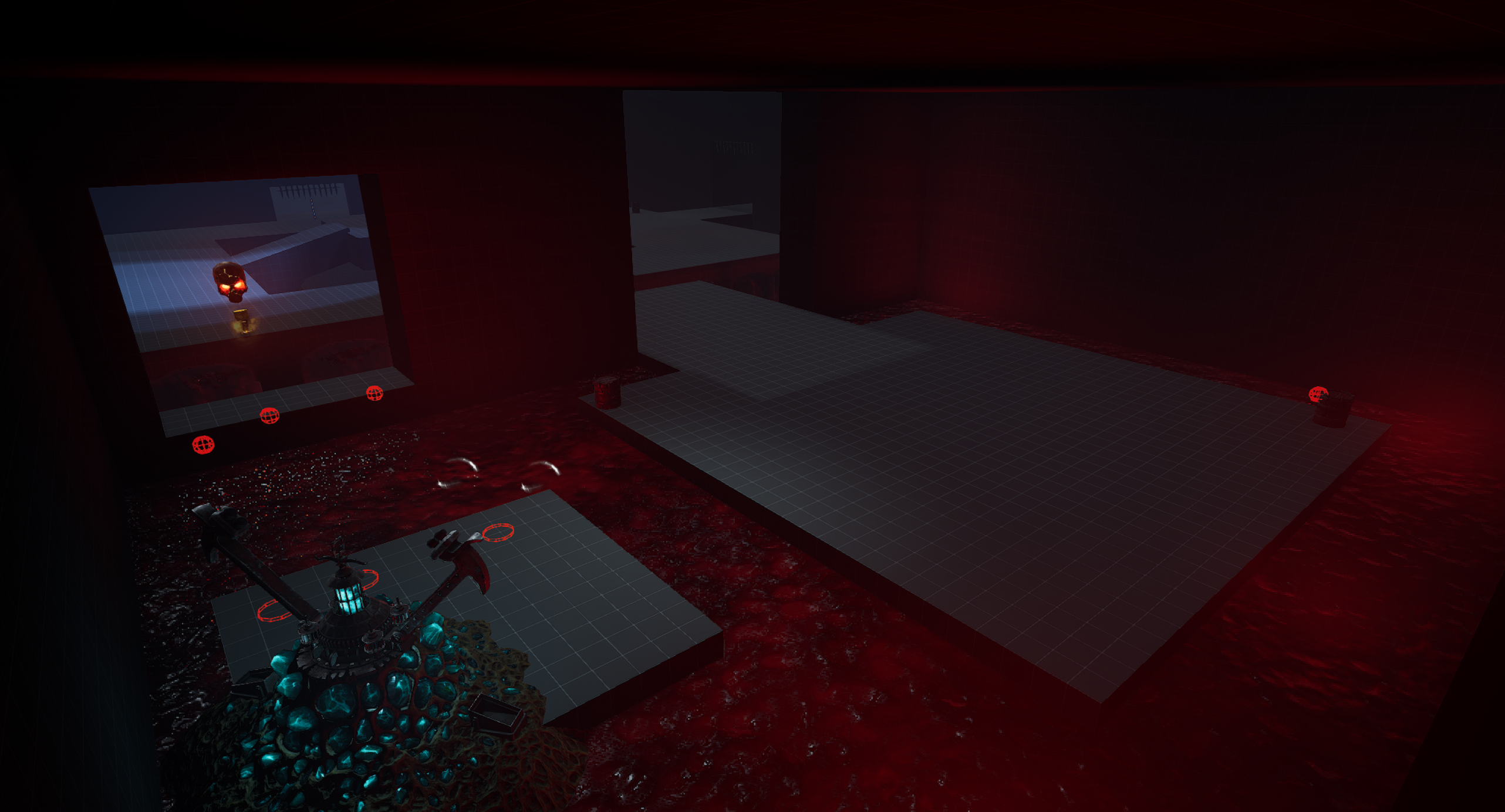 This is another arena loosely referencing the setting from the OG Painkiller — the Prison level. We wanted to capture a few key elements, such as the cell exit and the guard tower overlooking the arena. Our interpretation is a blood-soaked prison with a large blood pool in the center of the arena. As for the level’s overall form, I was heavily inspired by arenas from retro shooters like Quake. The arena features sharp angles and simple shapes. It includes side rooms that are accessible depending on the randomly selected objective for the arena. Environment art was done by Eryk Kossakowski.