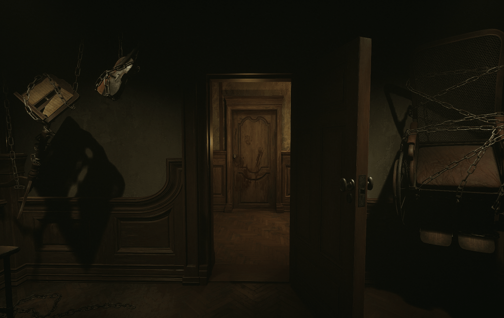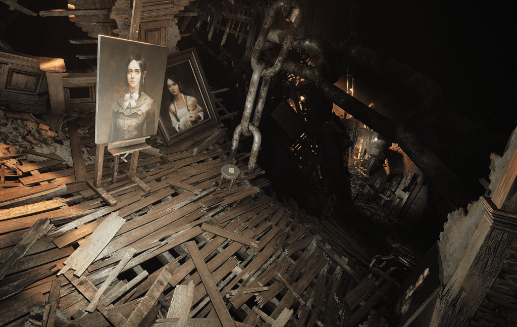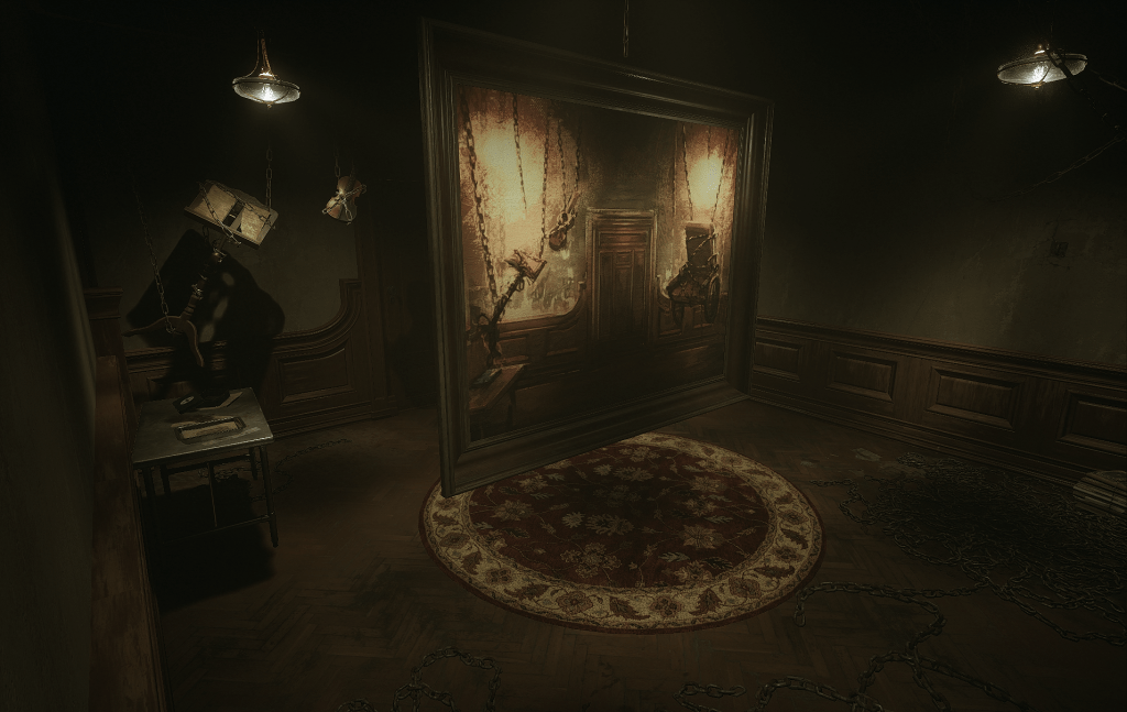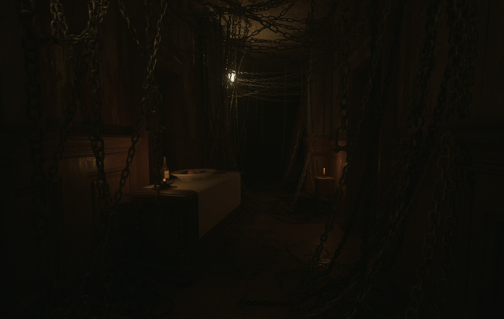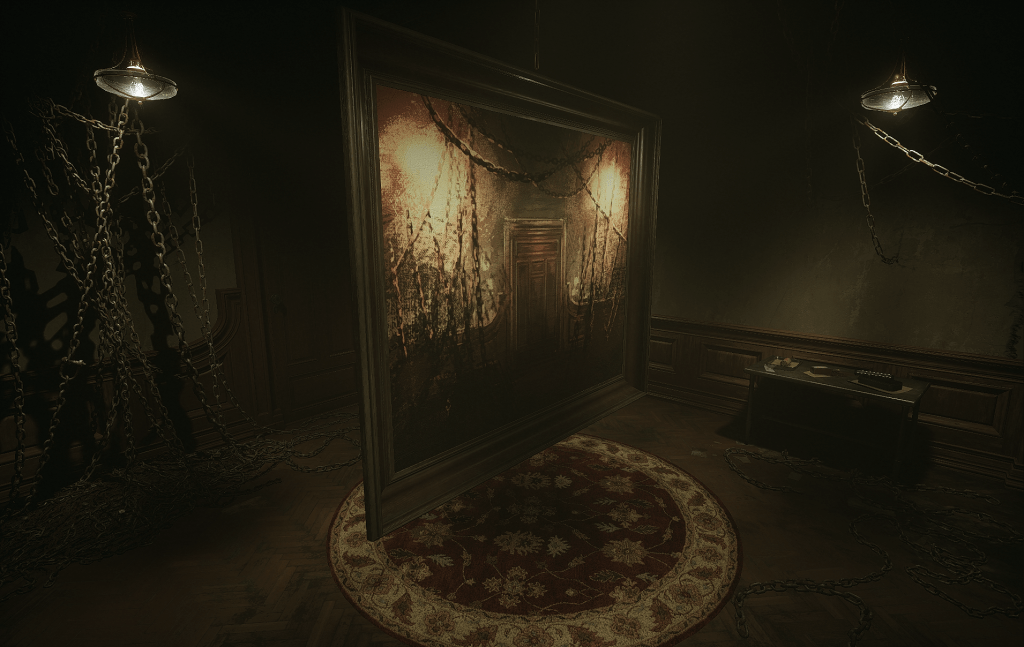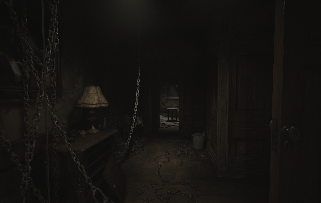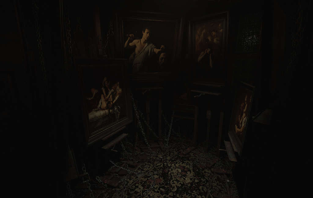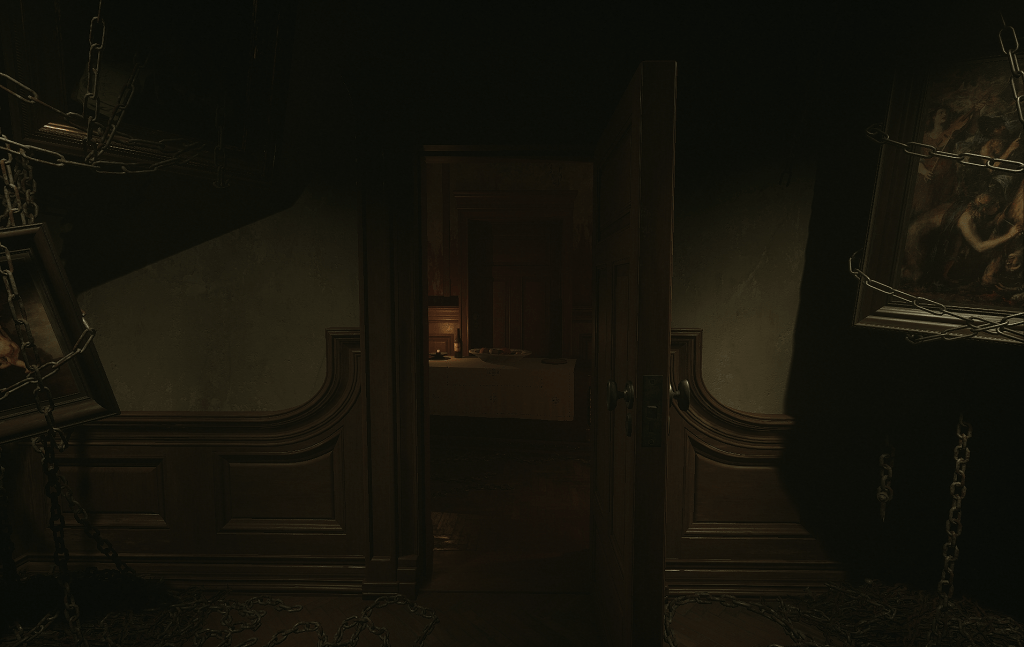 One of the more enjoyable mind-bending tricks uses the long corridor from The Painter’s Story and Chapter 3. In the original 2016 game, the Wife would pass by the window along this corridor – this DLC partially recreates that scene. Players enter a room and walk along the outside of the building past the windows; after entering the next room and snapping the chain, they return via the interior, which is a nod to the 2023 version’s encounter.