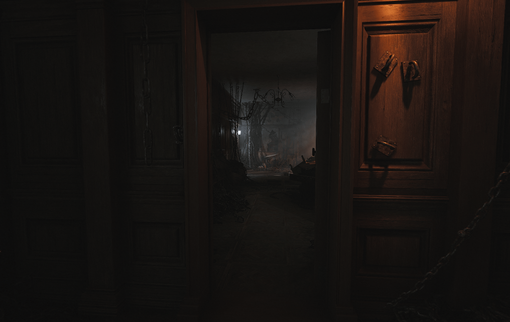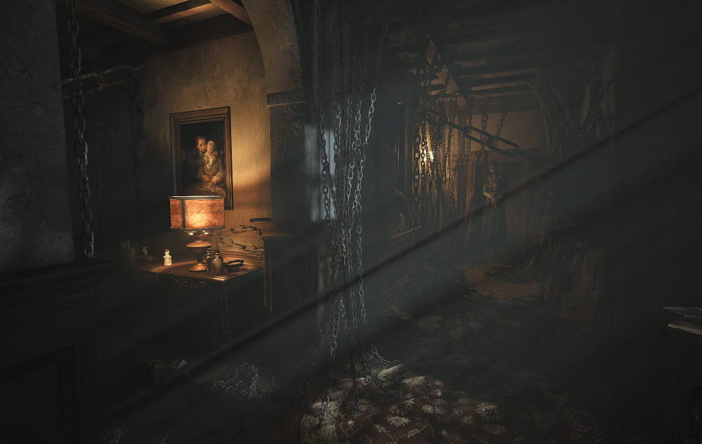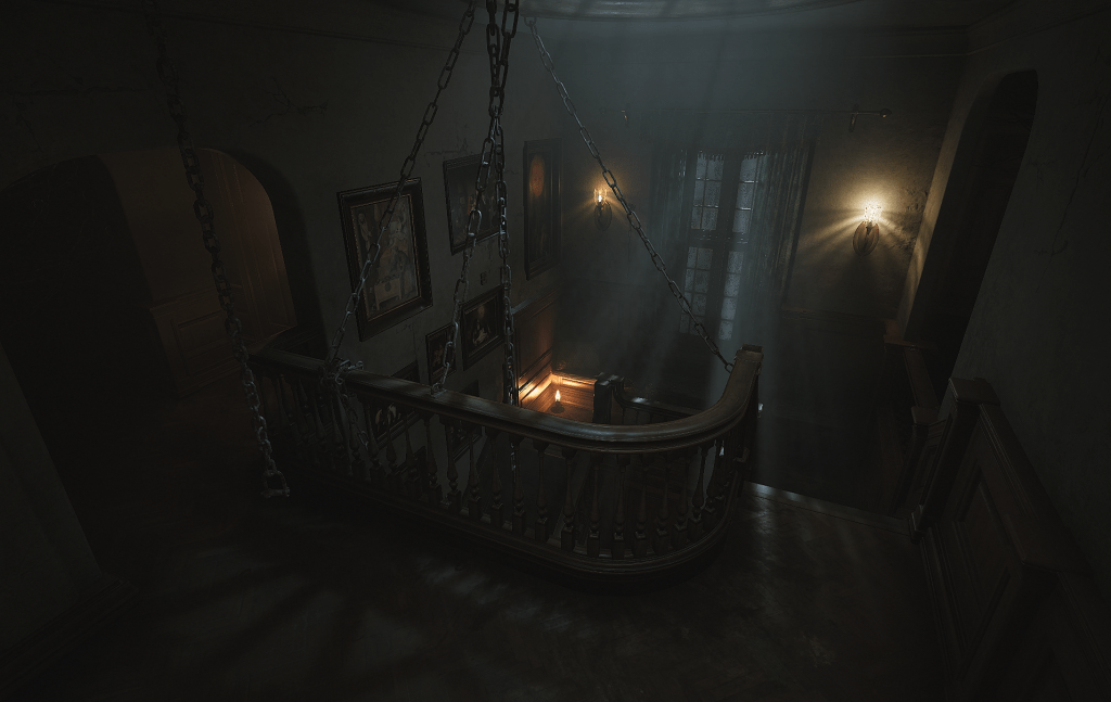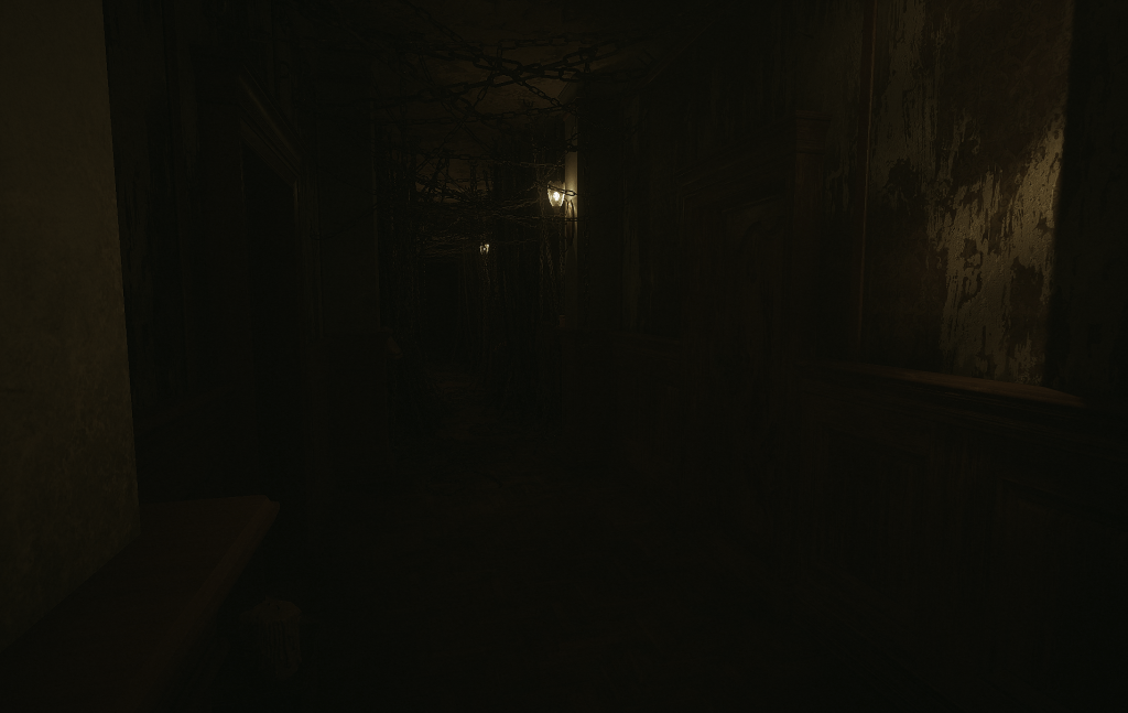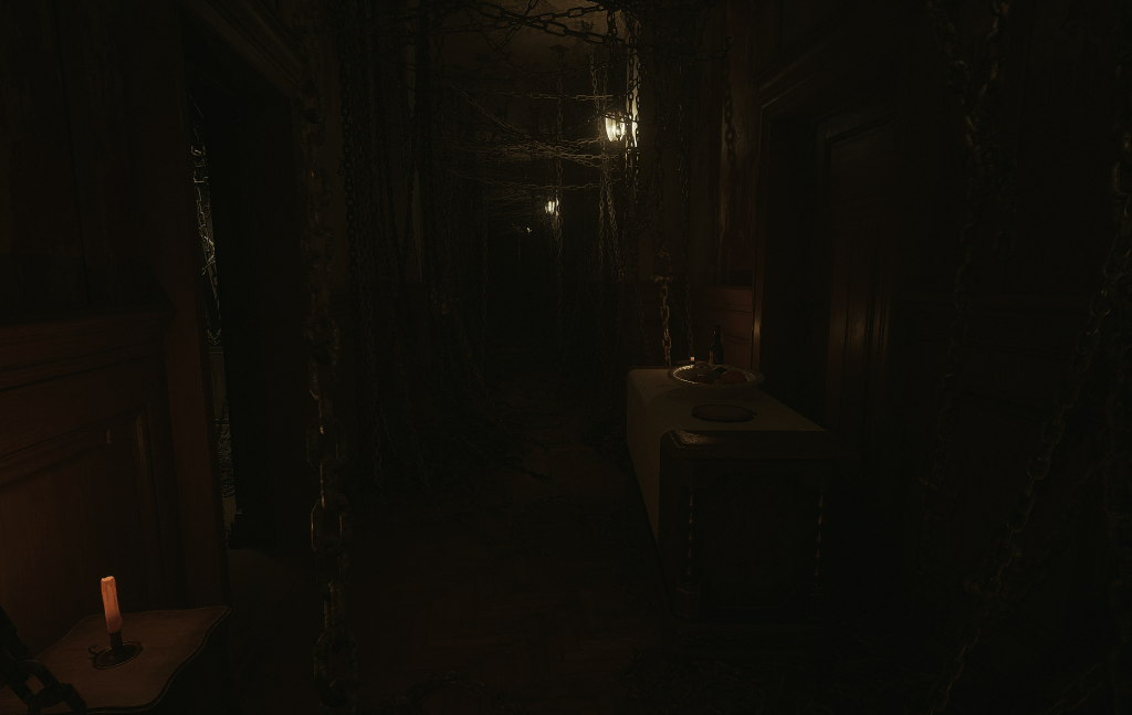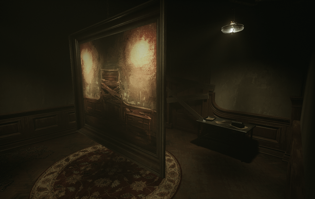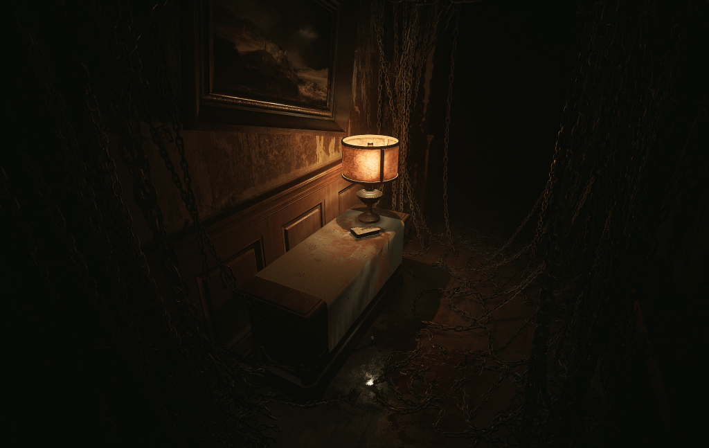 One of the more enjoyable mind-bending tricks uses the long corridor from The Painter’s Story and Chapter 3. In the original 2016 game, the Wife would pass by the window along this corridor – this DLC partially recreates that scene. Players enter a room and walk along the outside of the building past the windows; after entering the next room and snapping the chain, they return via the interior, which is a nod to the 2023 version’s encounter.