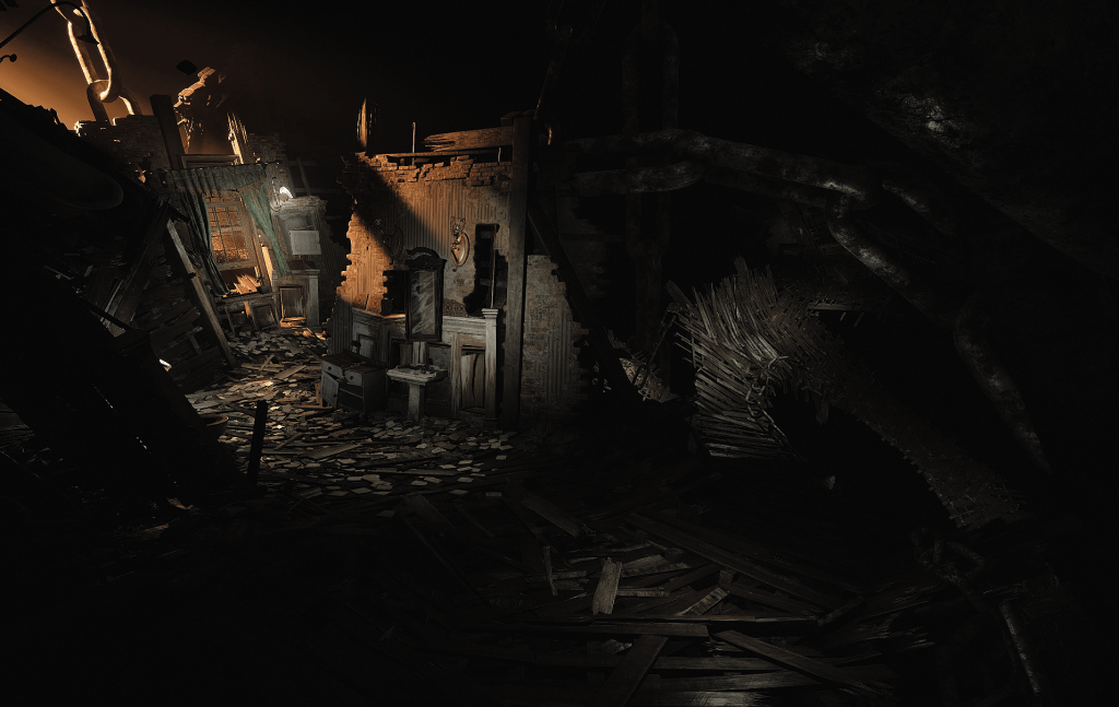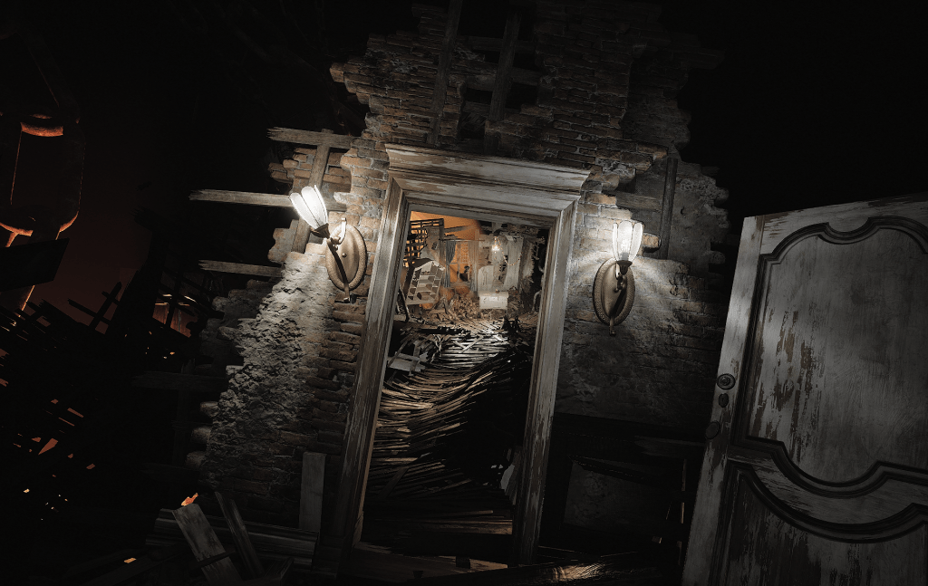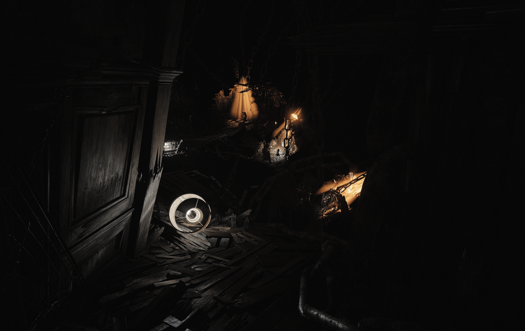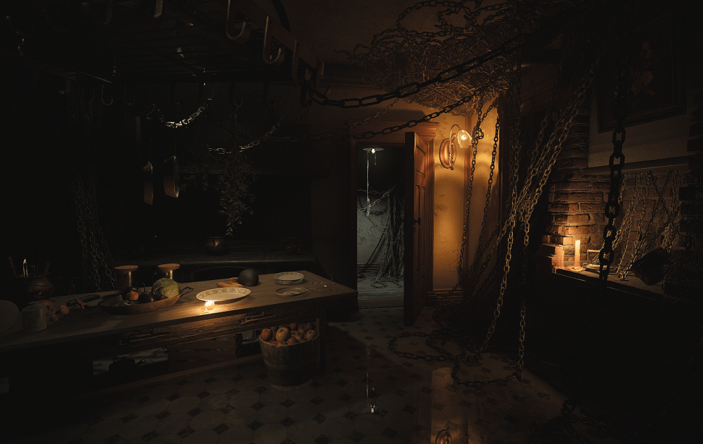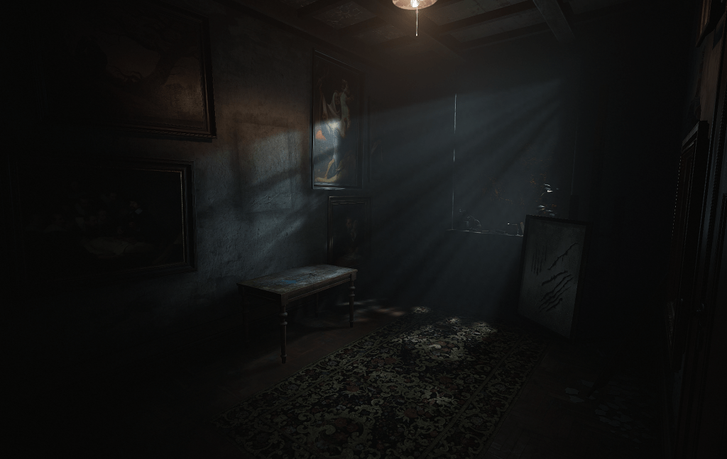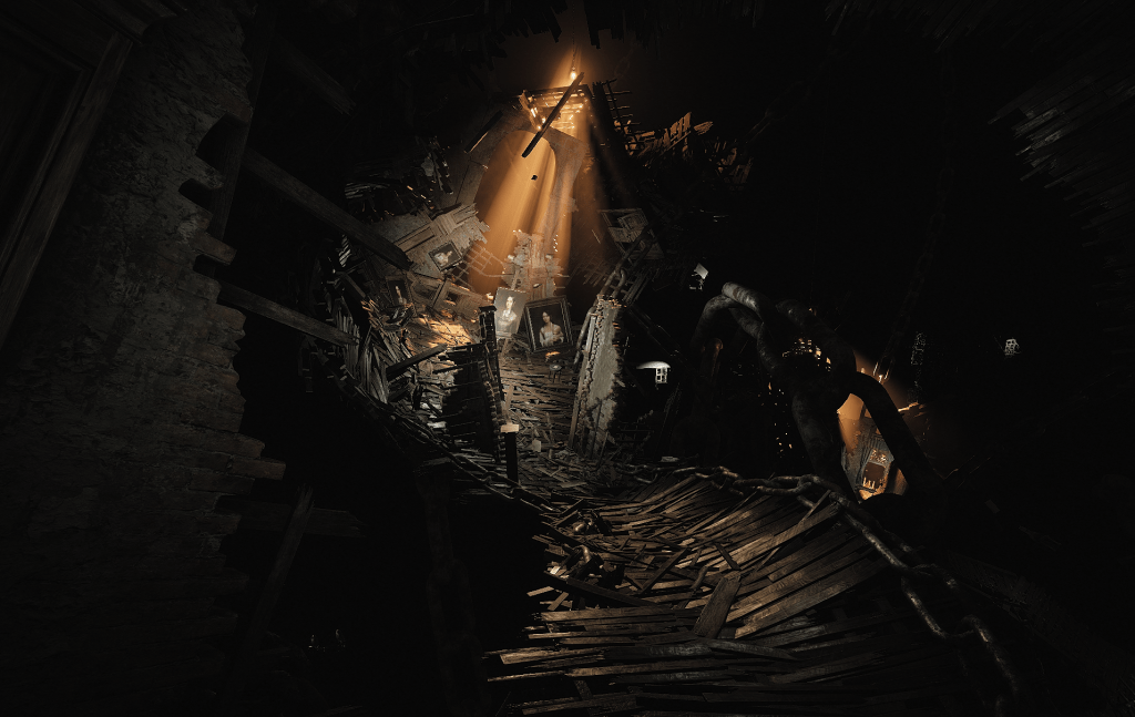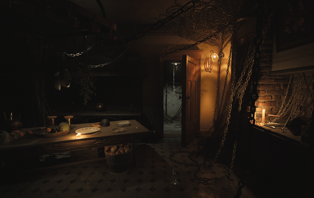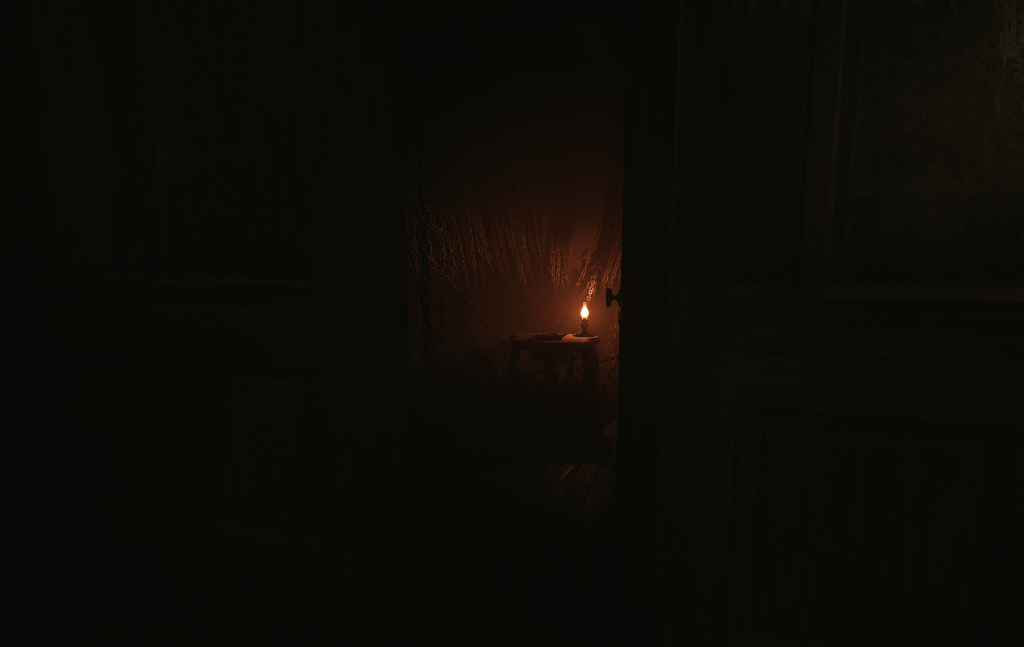 One of the more enjoyable mind-bending tricks uses the long corridor from The Painter’s Story and Chapter 3. In the original 2016 game, the Wife would pass by the window along this corridor – this DLC partially recreates that scene. Players enter a room and walk along the outside of the building past the windows; after entering the next room and snapping the chain, they return via the interior, which is a nod to the 2023 version’s encounter.