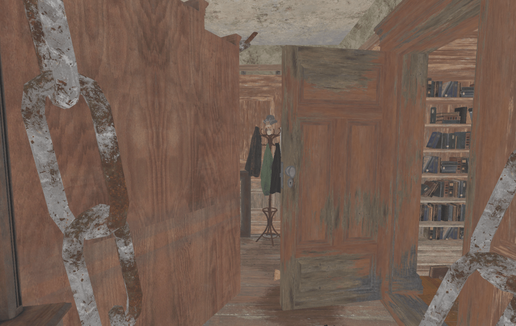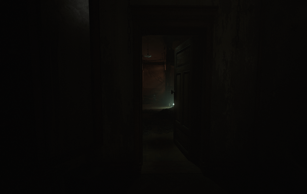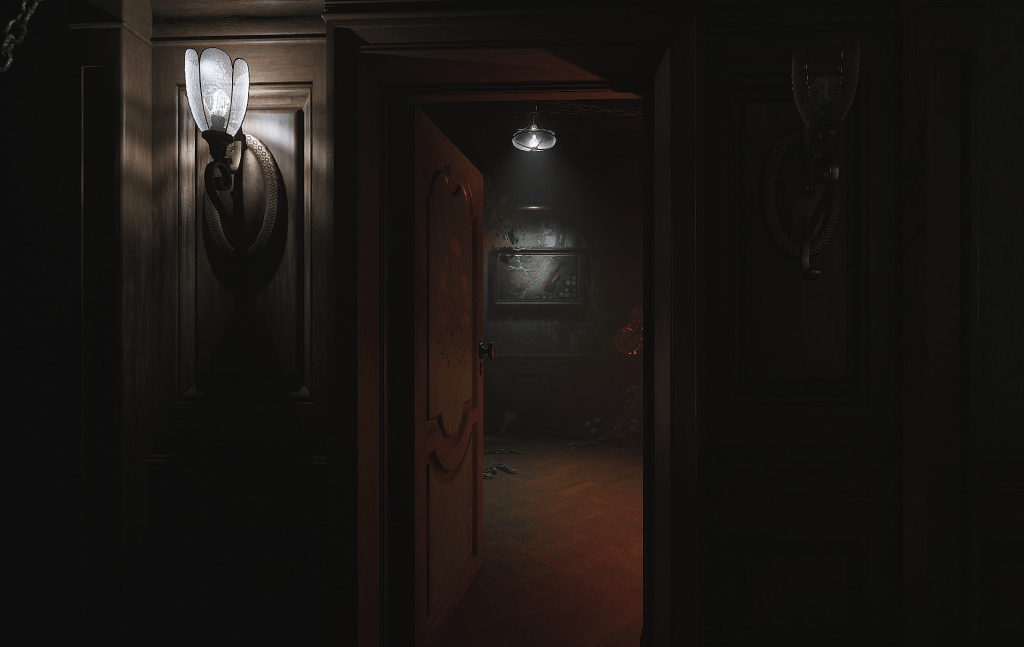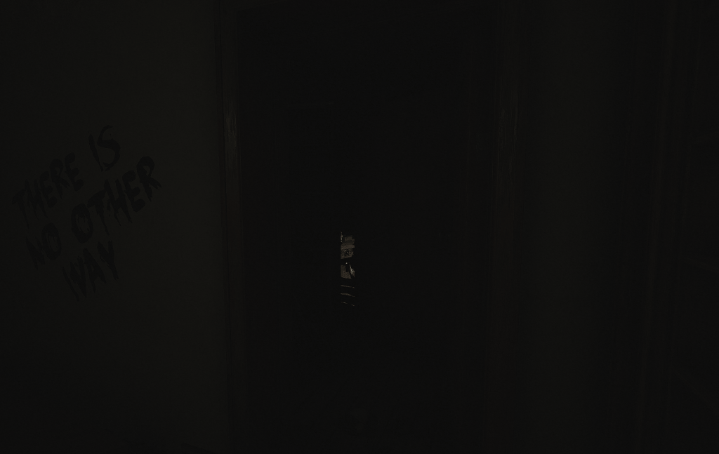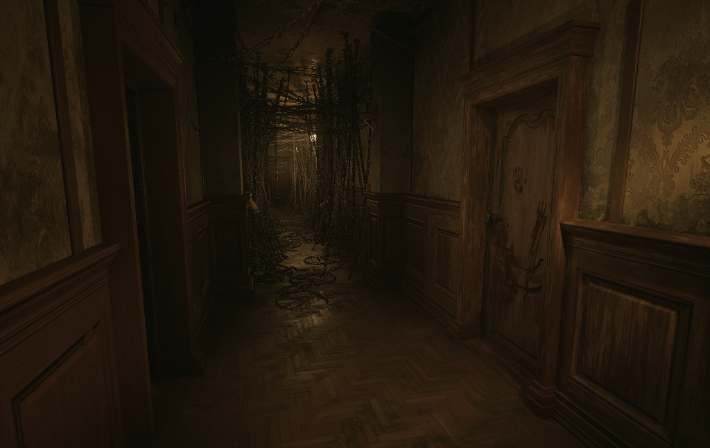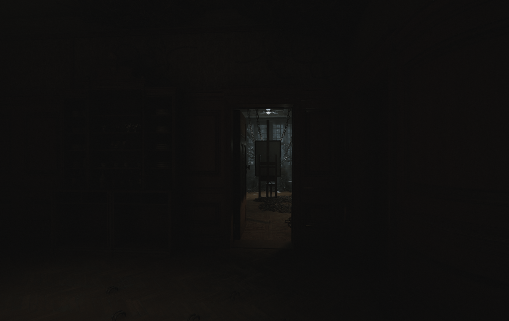 In the first section, the entrance to the item room is straight ahead, marked with handprints—meant to tutorialize and acclimate the player to the loop formula. Optional mood beats are set: looking right shows the Painter disappearing behind a closed door; after picking up the item, in the same spot behind the door, the Wife/Musician disappears.
