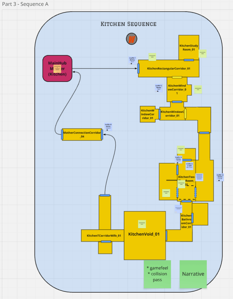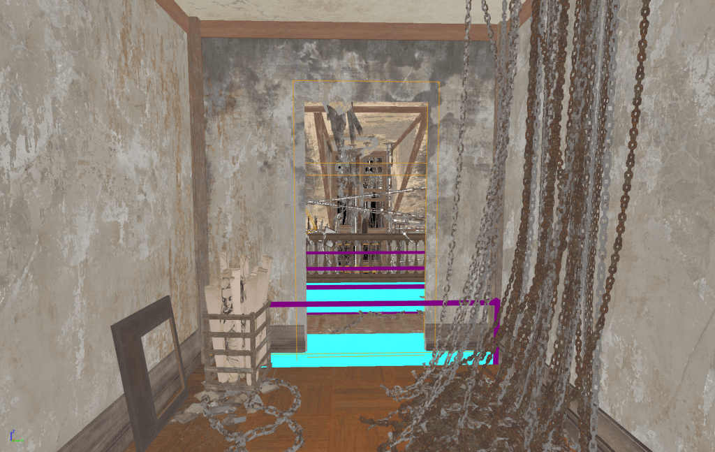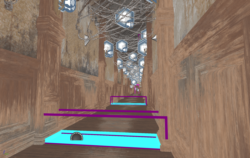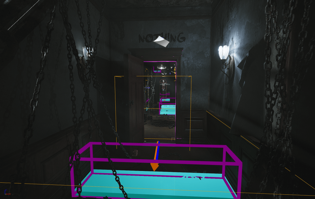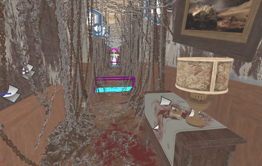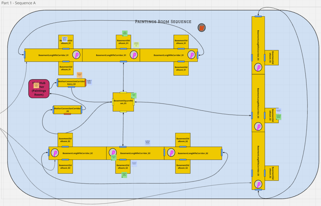 The sequence was split across multiple floors, built around a single duplicated corridor that looped. Interacting with the painting transports players to lower segments.