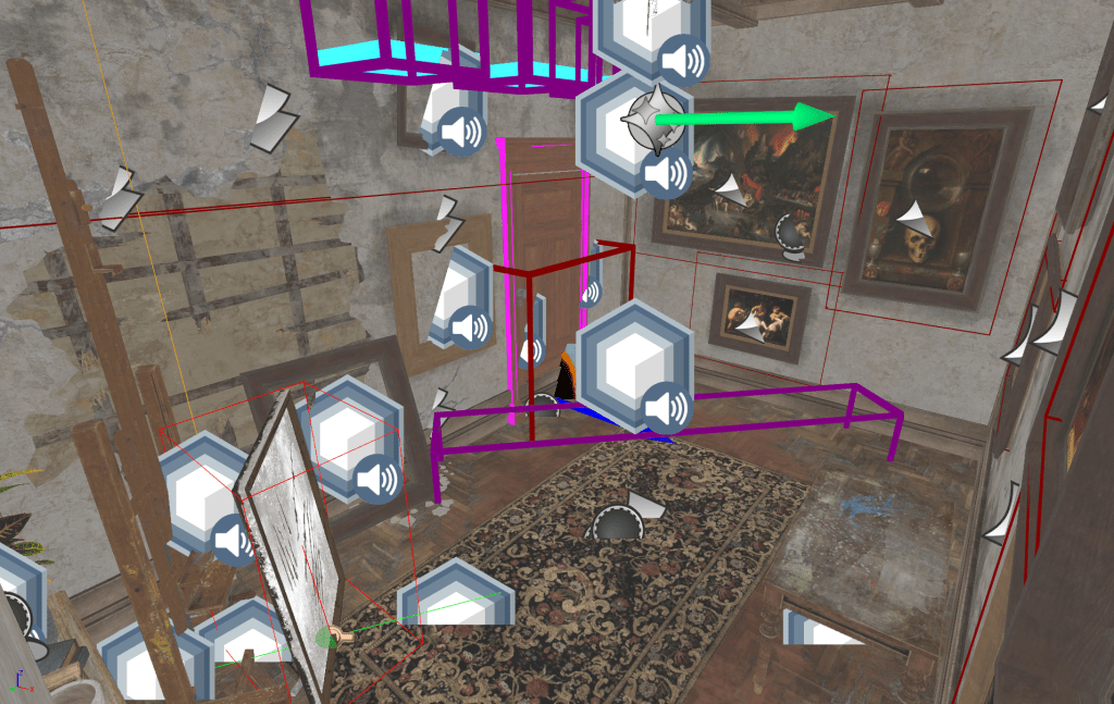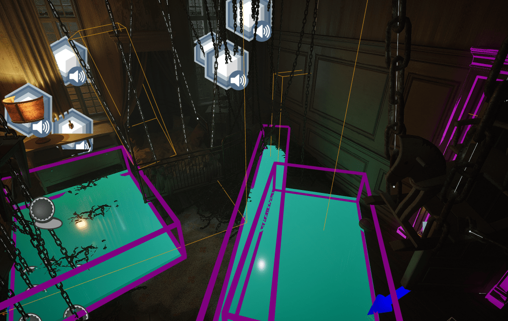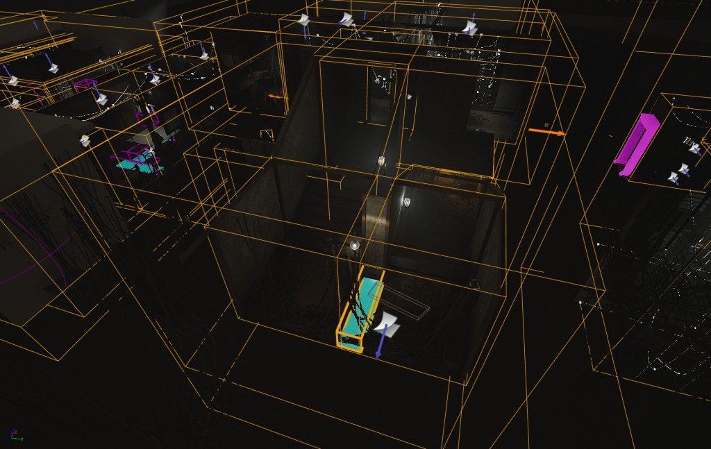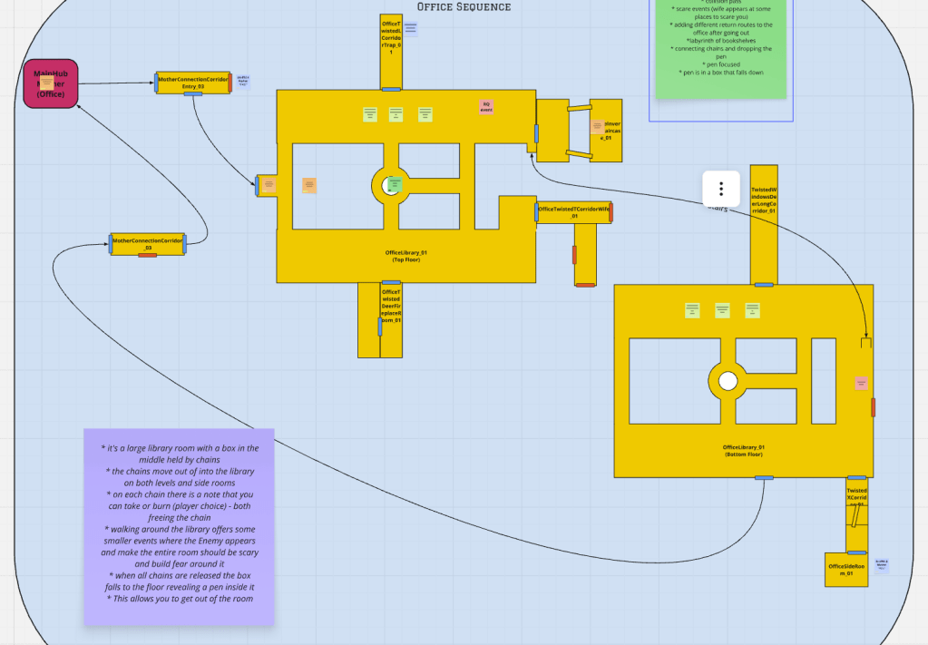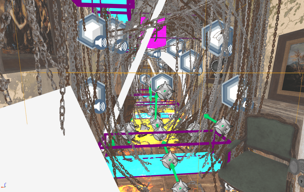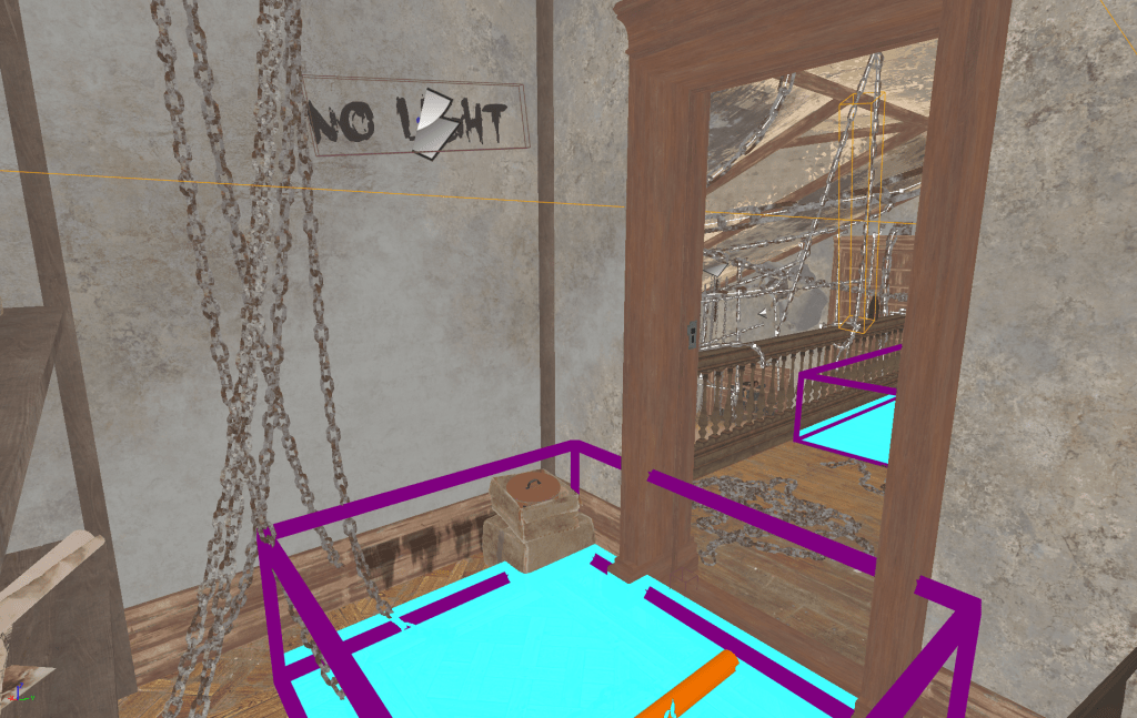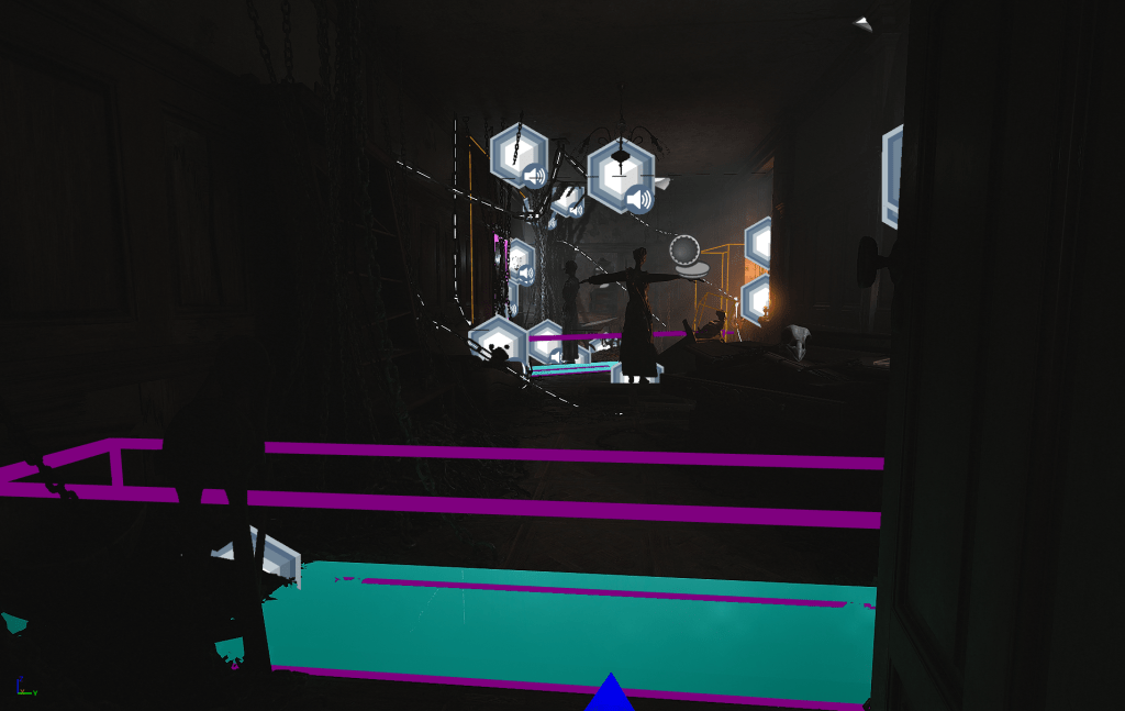 The sequence was split across multiple floors, built around a single duplicated corridor that looped. Interacting with the painting transports players to lower segments.