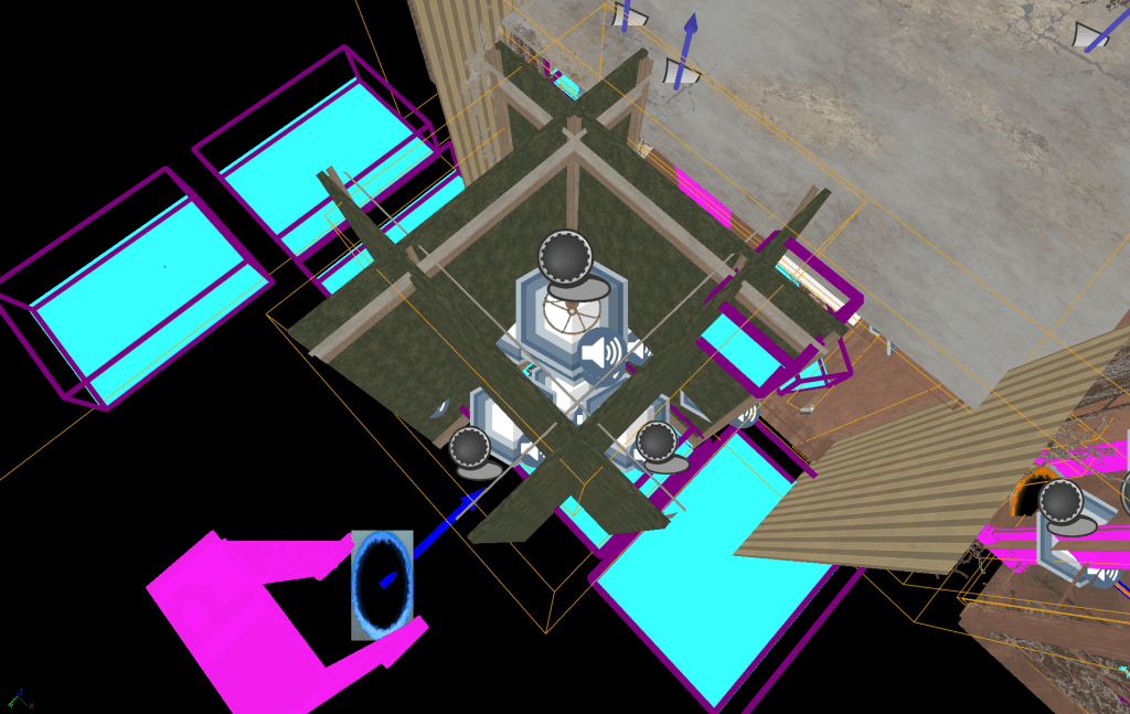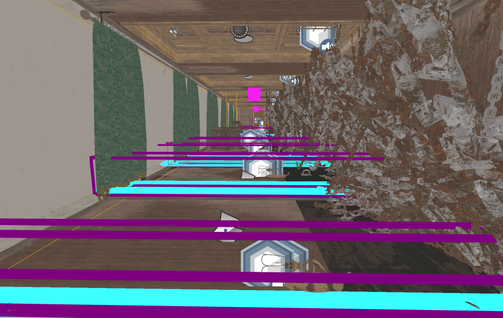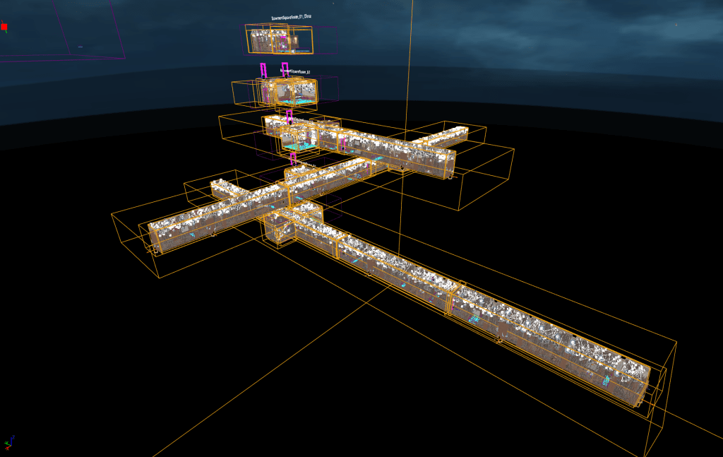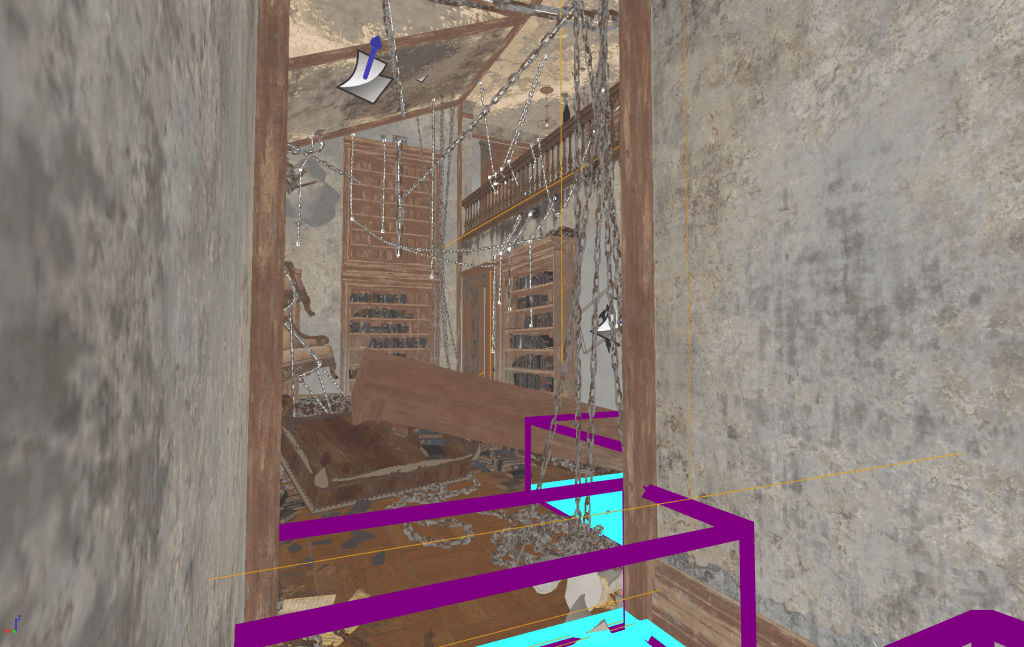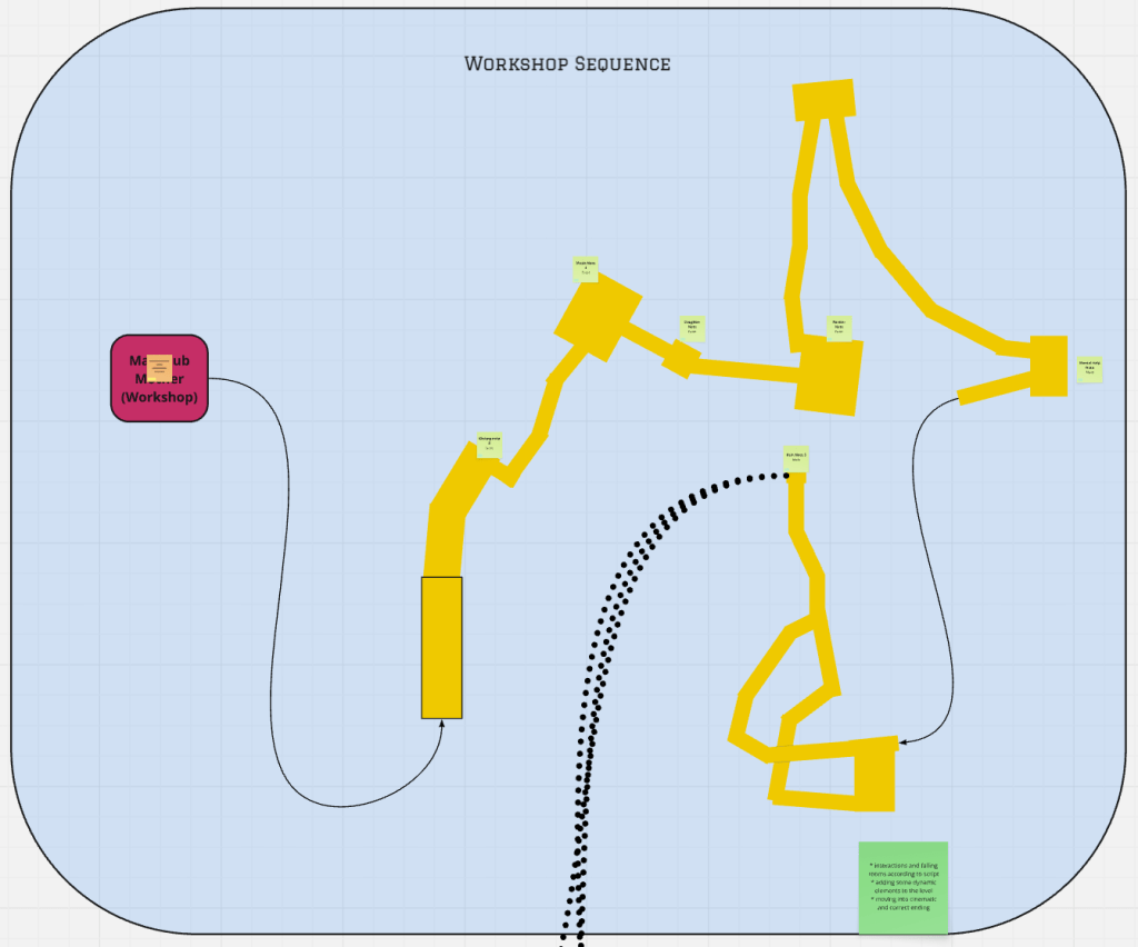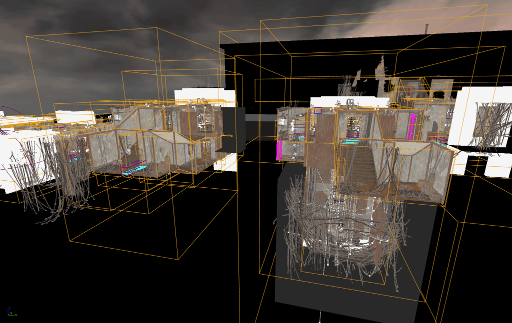 The sequence was split across multiple floors, built around a single duplicated corridor that looped. Interacting with the painting transports players to lower segments.