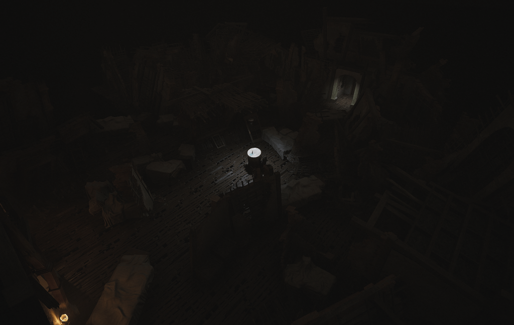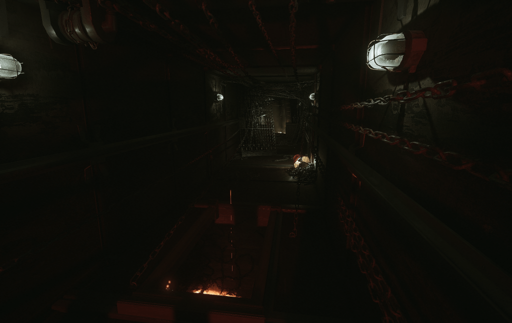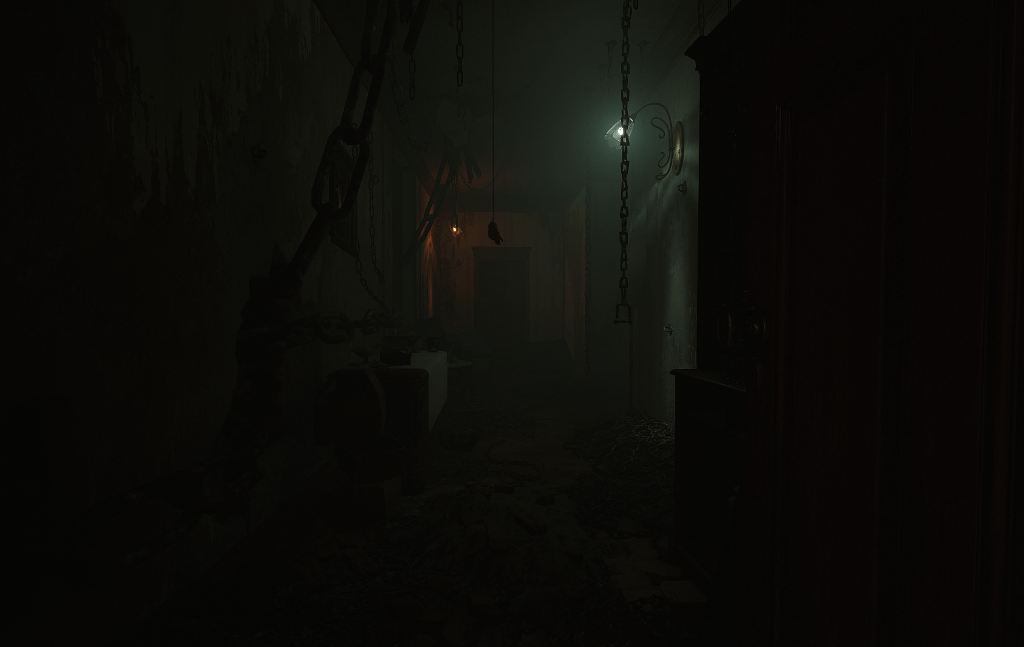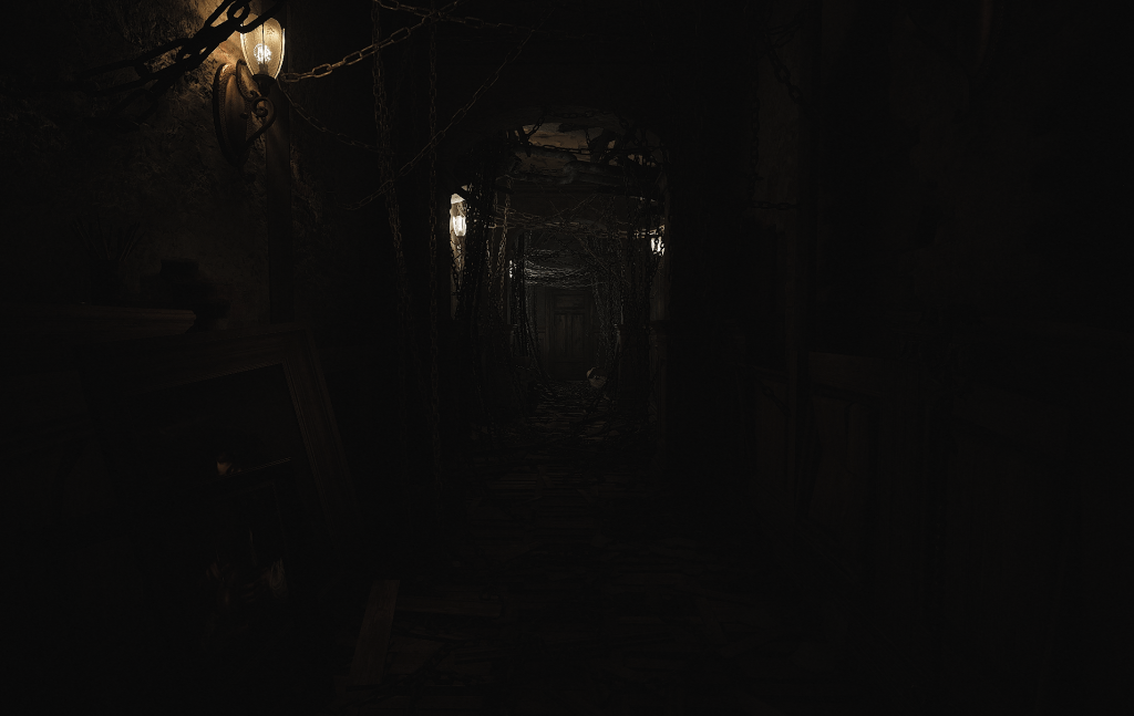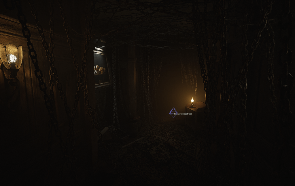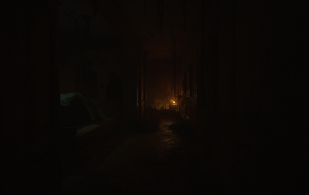 The first corridor is a connector; it’s the entry and exit to the sequence (you leave by breaking the chains on the door—symbolism). Under a spotlight on a hanging shelf, we placed a flashlight—a gameplay element for combat and interactions, analogous to the lantern from the Painter’s Story.