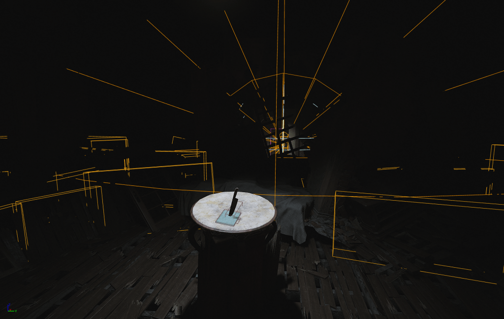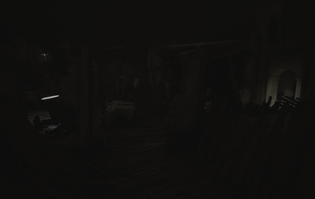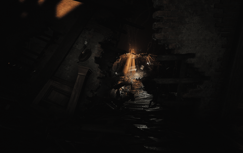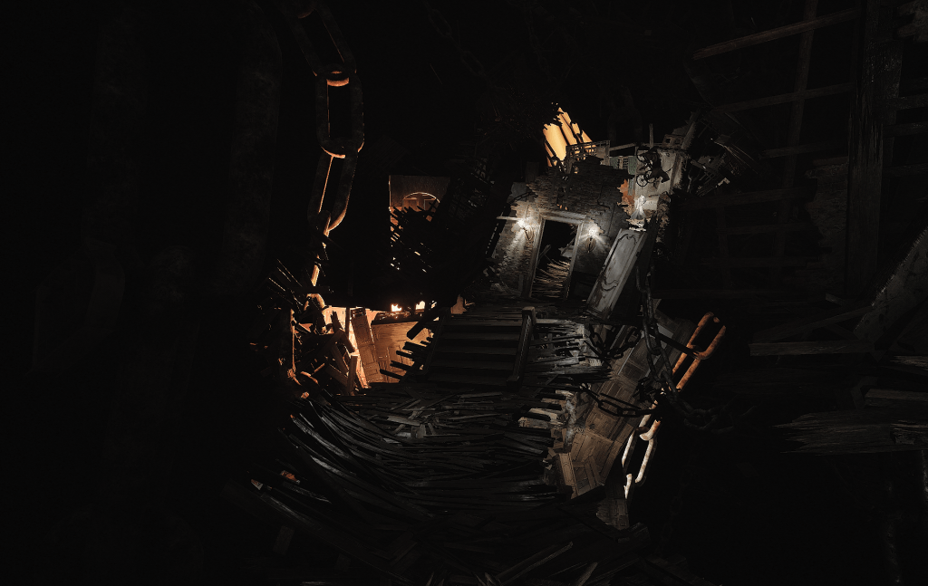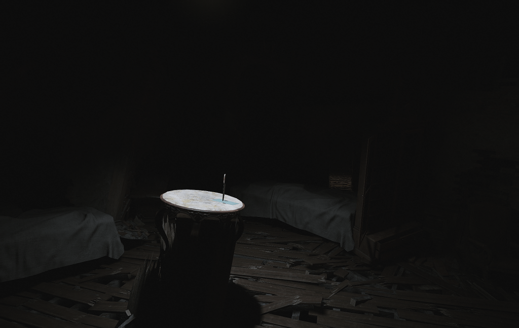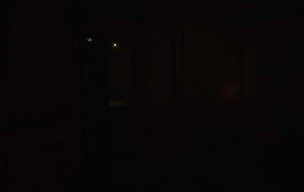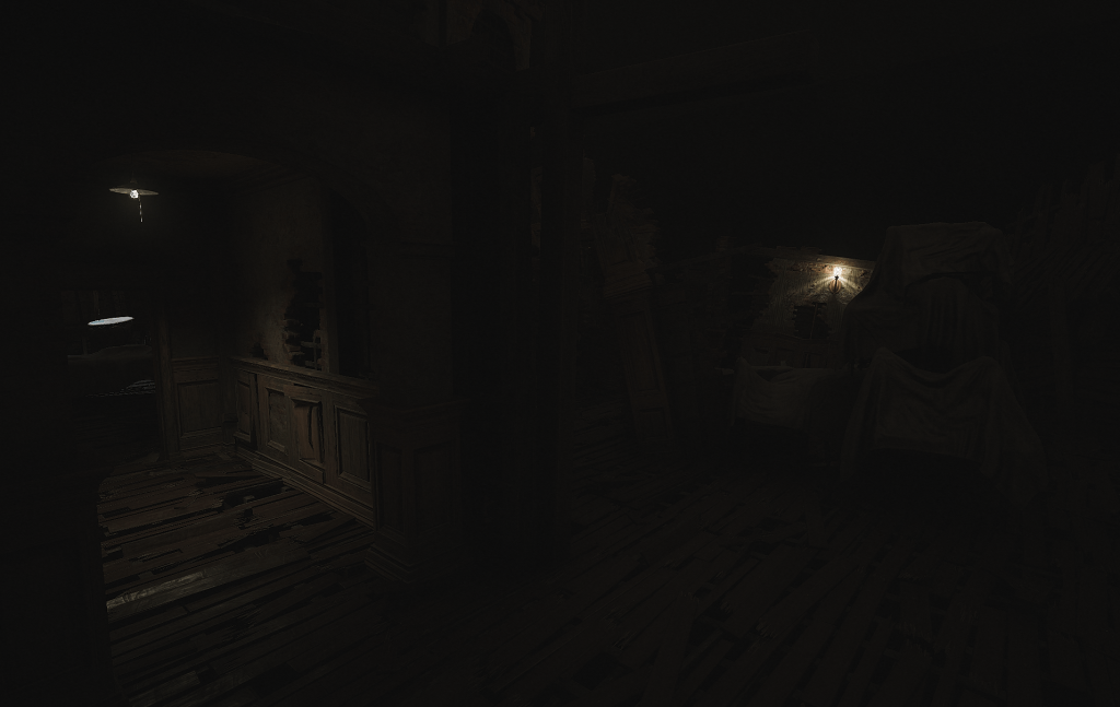 The first corridor is a connector; it’s the entry and exit to the sequence (you leave by breaking the chains on the door—symbolism). Under a spotlight on a hanging shelf, we placed a flashlight—a gameplay element for combat and interactions, analogous to the lantern from the Painter’s Story.