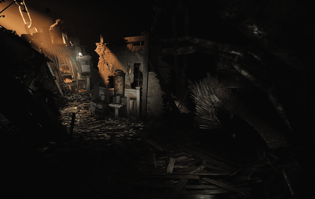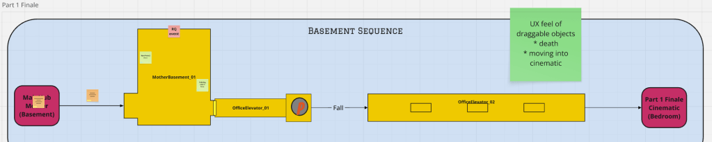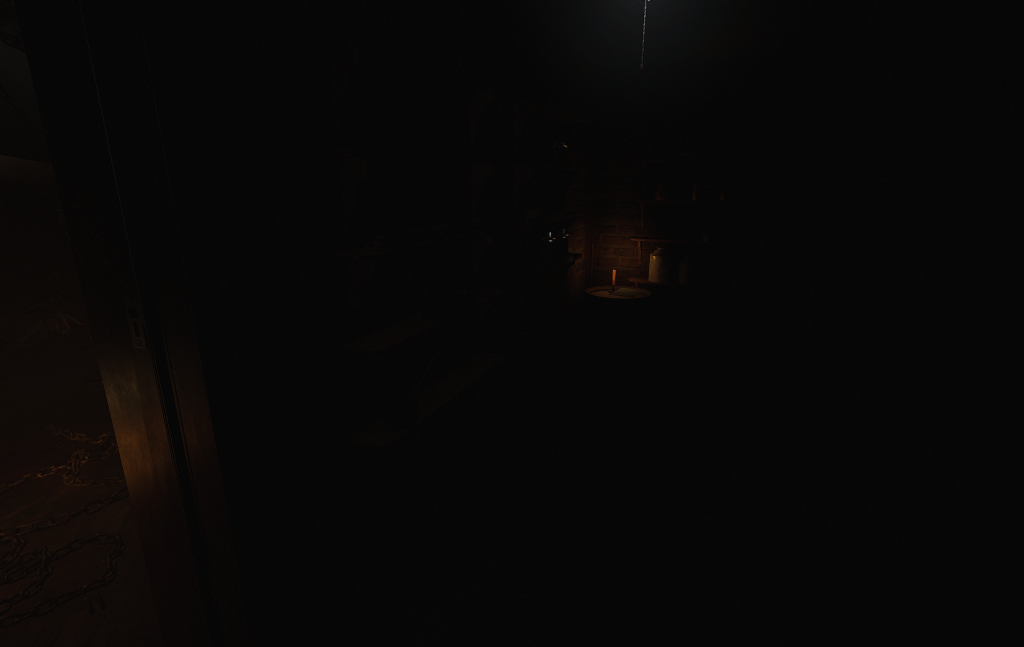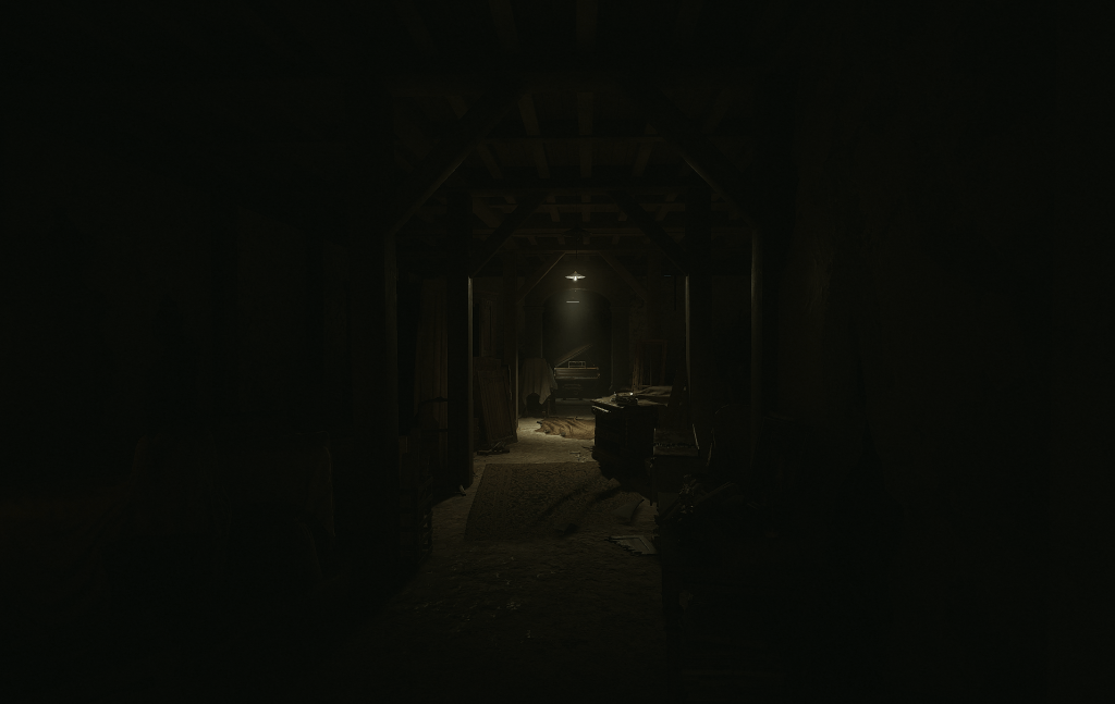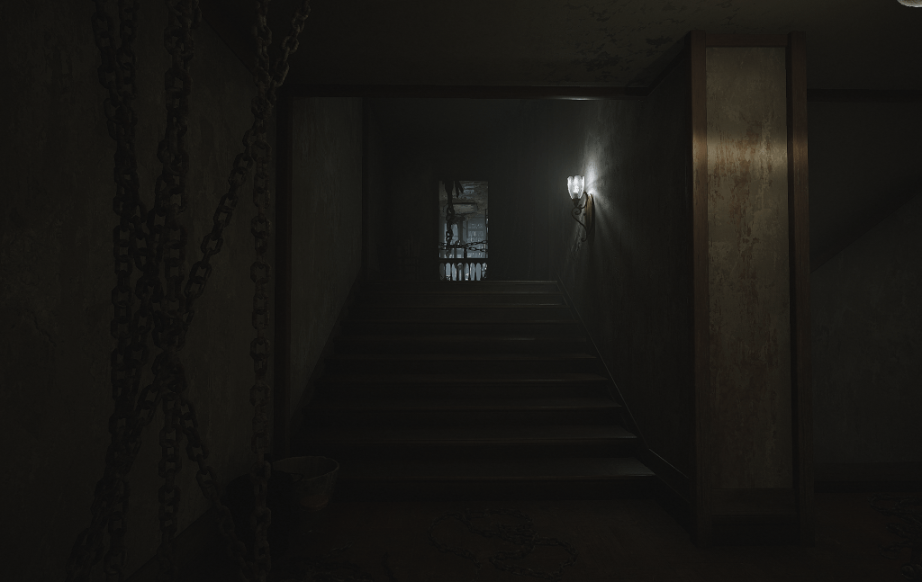 After leaving the Closet, the light leads to the Basement, where a piano – Musician’s artifact – can be seen at the far end. After the interaction and event, the players turn around and see a transformed Basement leading to a room with an elevator.