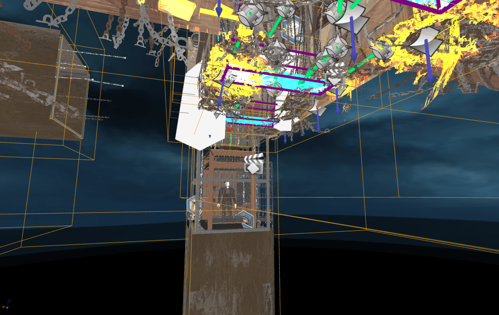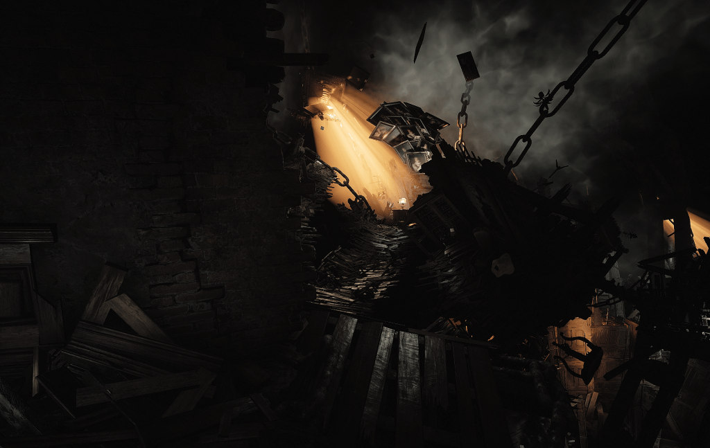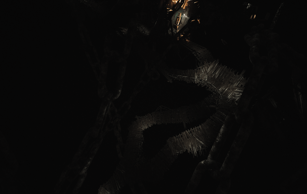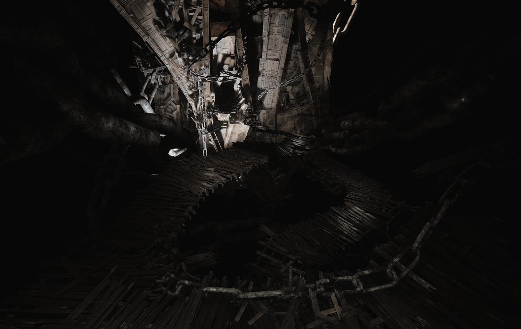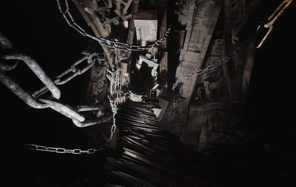 This is similar to the final sequence from Chapter 6 of the Painter’s story — a kind of memory lane where the character traverses corridors and catwalks hanging in the void and visits fragments of familiar rooms, connected by chains that fall apart as the level progresses.