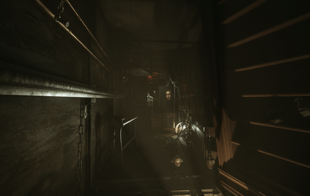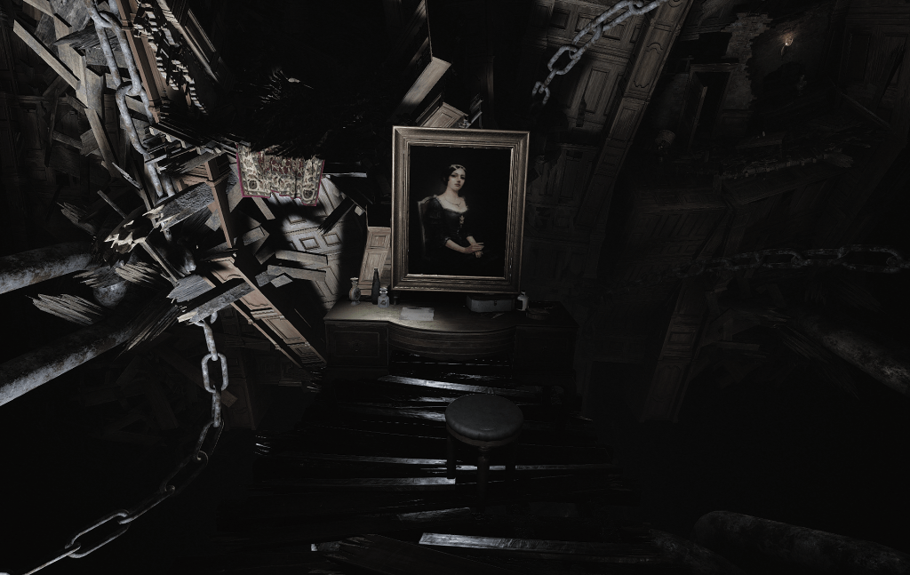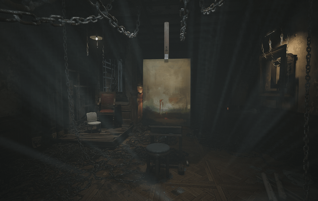 The first sequence starts in a storage room with the painter’s portrait. The main task is to find three items related to pain and place them in the correct spot in a room with a rotating painting. The player unlocks further sections of the house by rotating the painting, which reflects what is behind it. Each section is a repetition of the same corridor and the room with the item in different arrangements. The player walks the looped chained corridor looking for the correct room that contains the item. In this sequence players also have the first combat with the main enemy — a dark vision of the Musician — representing how she perceives herself.