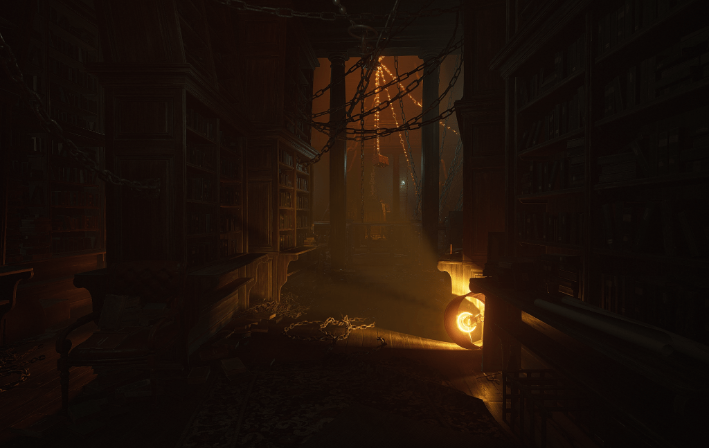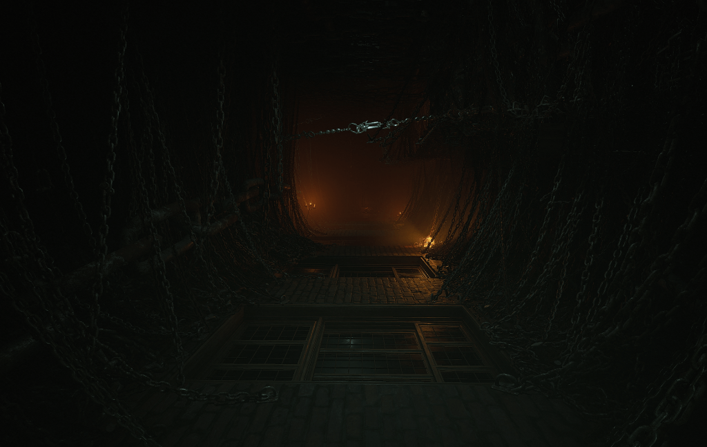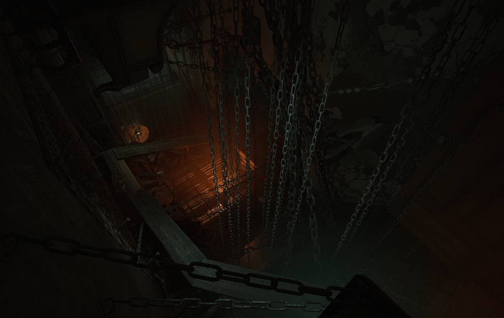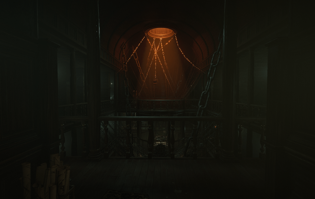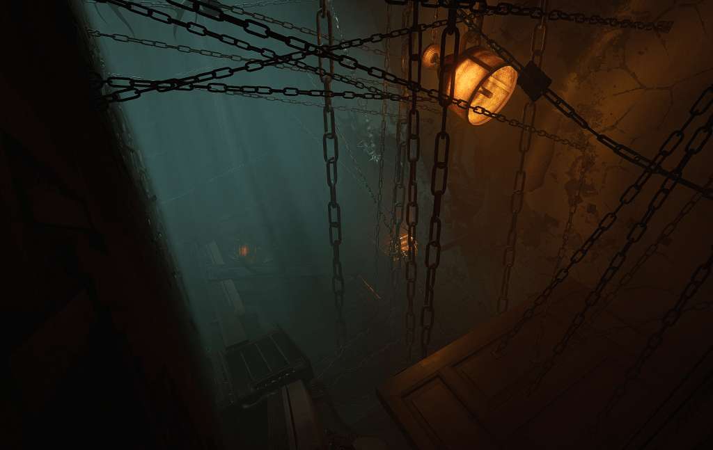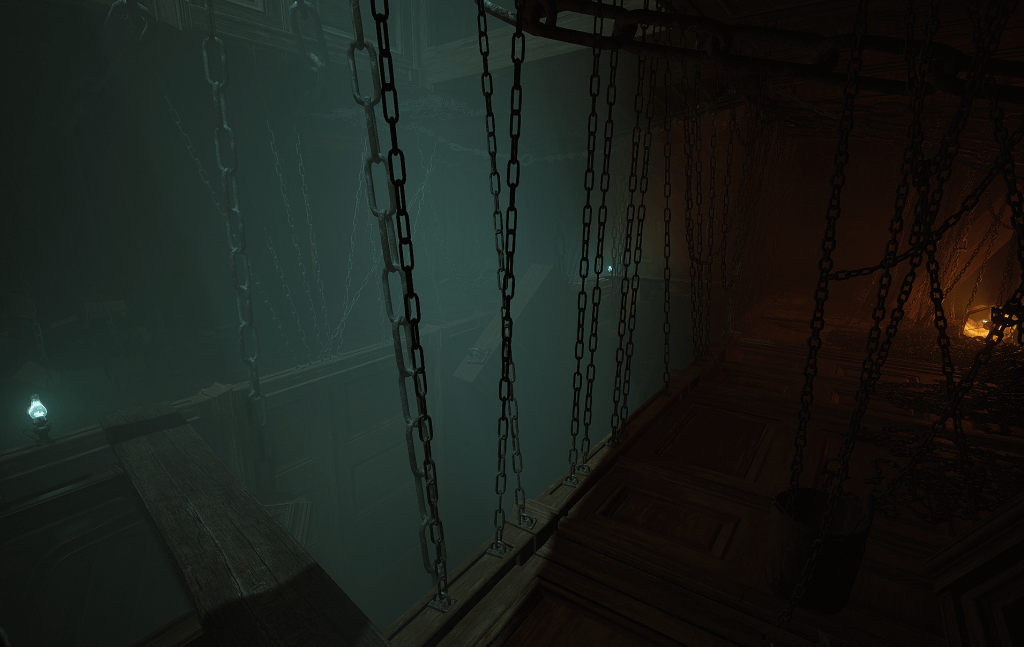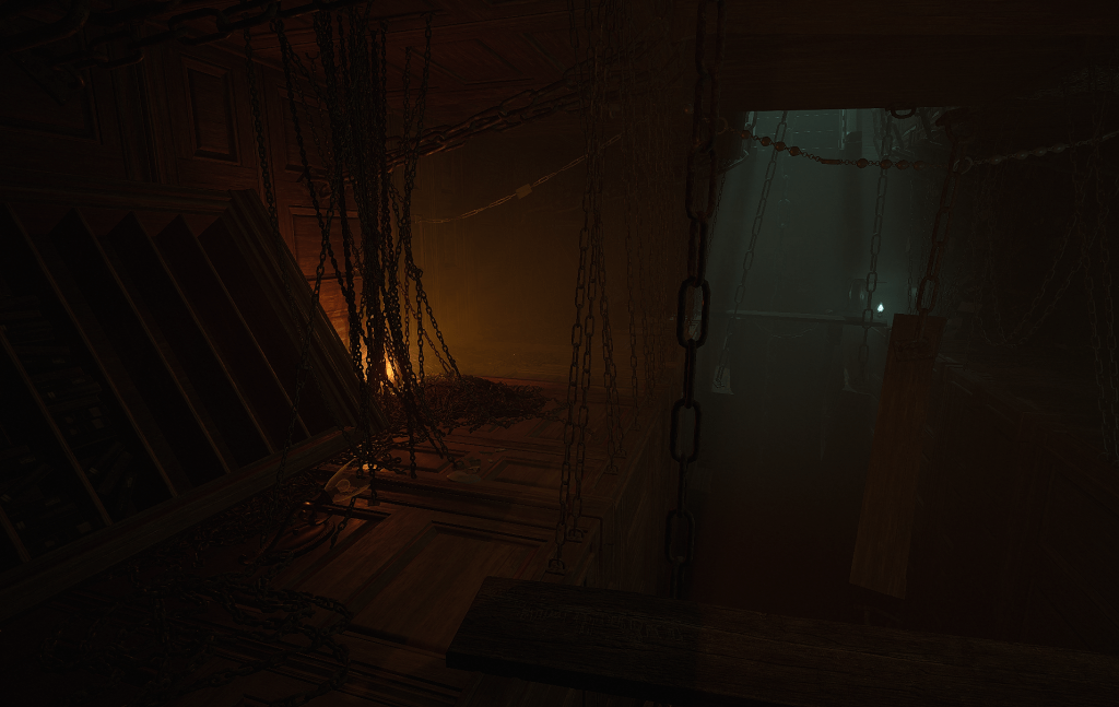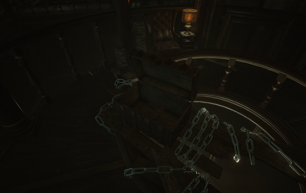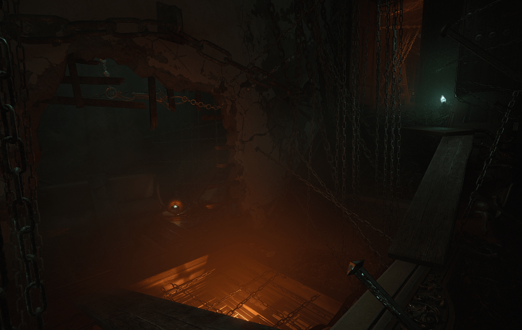 At the center of the room hangs a chest hanging on distinctive chains. Following the guidance, players encounter a blocked path and a note binding one of the chains – after picking up the note, the chain snaps, the obstruction breaks, and the chest can be seen descending, revealing the level’s main objective.