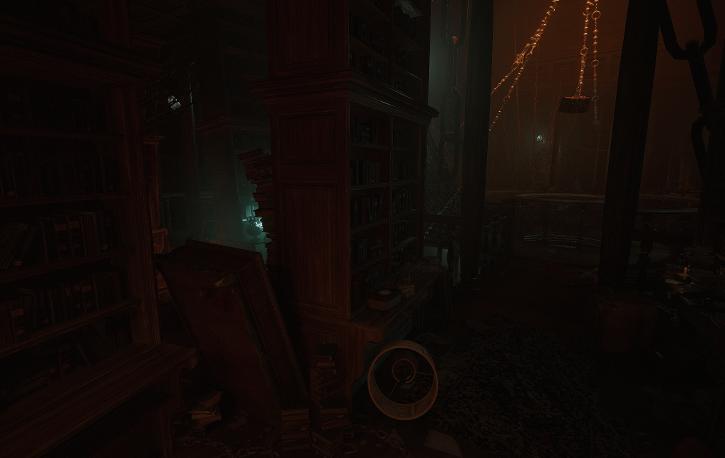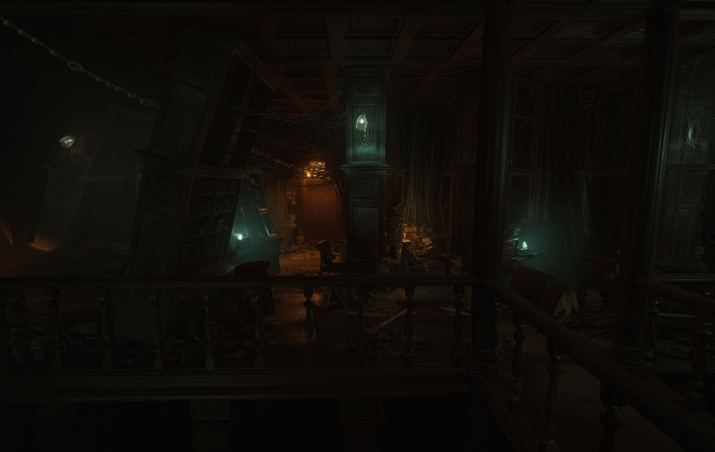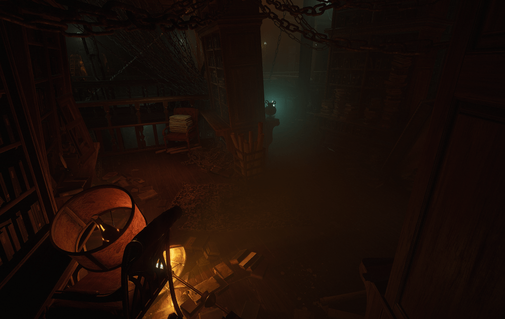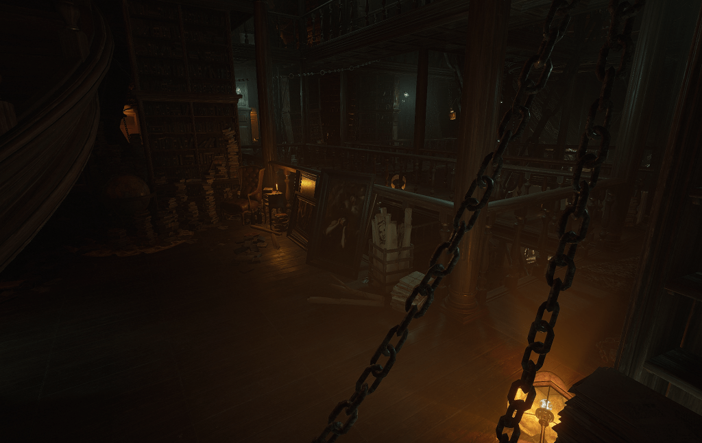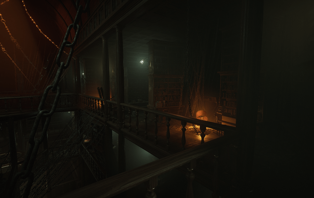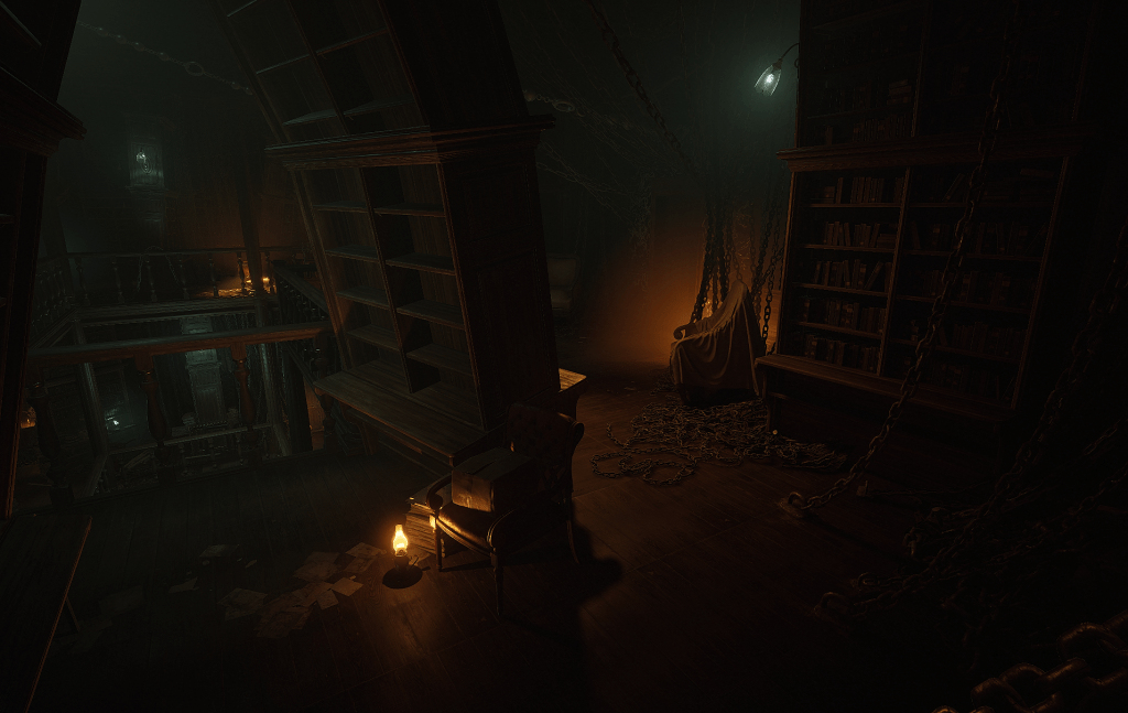 This is the largest room in the game — a huge, multi‑story library with a visible hanging chest in the center. The player must follow the chains and tear off notes that cause the chest to lower. At the end the player chooses which notes speak to them more — the more optimistic ones or the more negative ones.