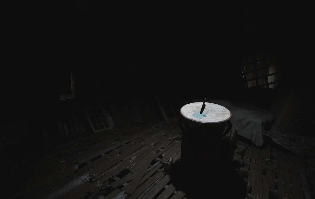 After escaping, players arrive in a dark room set in the void with a knife in the center that disappears as you approach. After picking up the note, players can see a key for the door across the way. Picking up the key triggers a combat sequence.